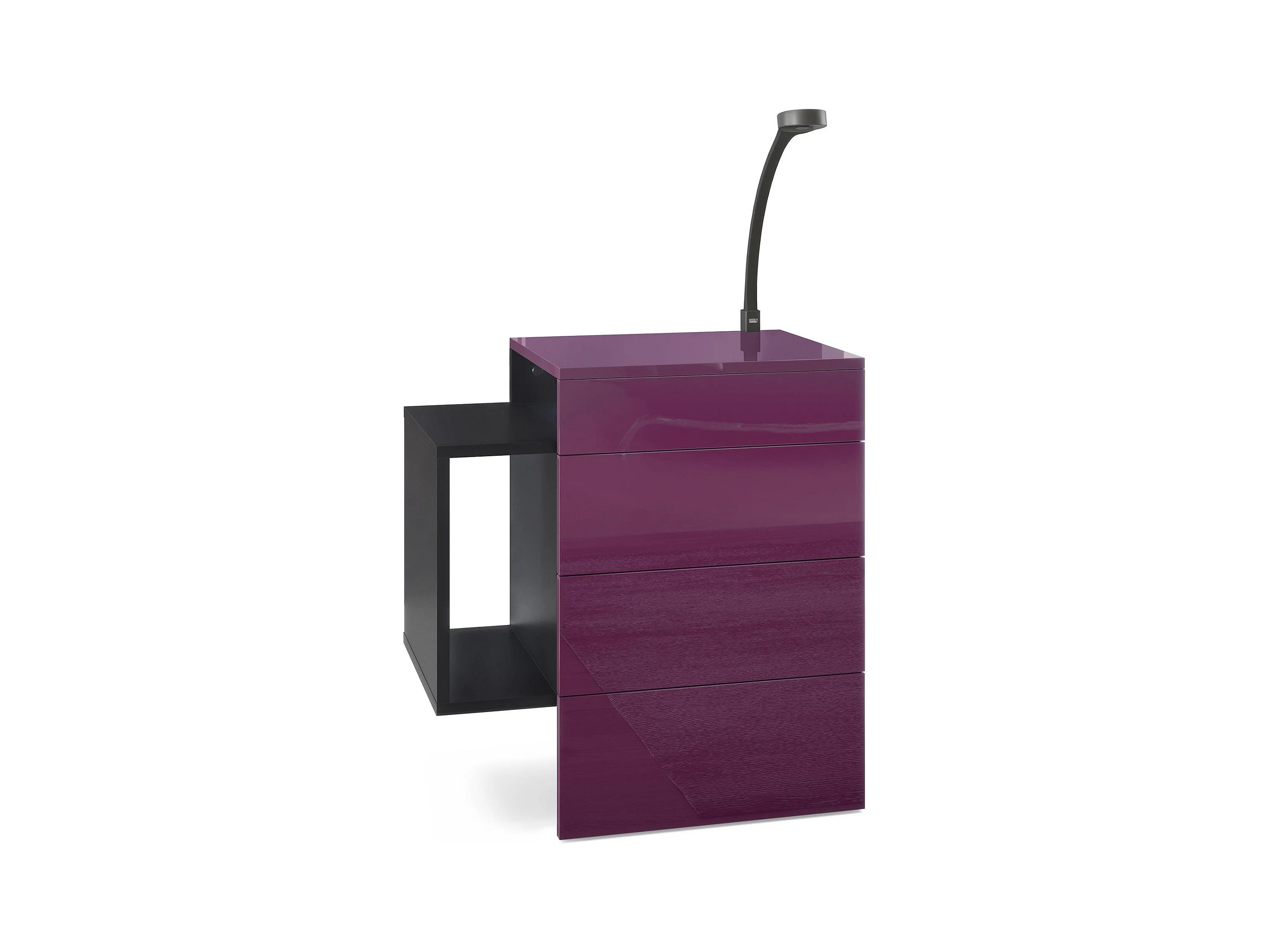 Table de chevet Queens, Table de nuit avec 2 tiroirs et 1 compartiment latéral à fixer au mur, Noir mat/Mûre brillant, incl. lampe LED Flexi (60x63x36 cm)
