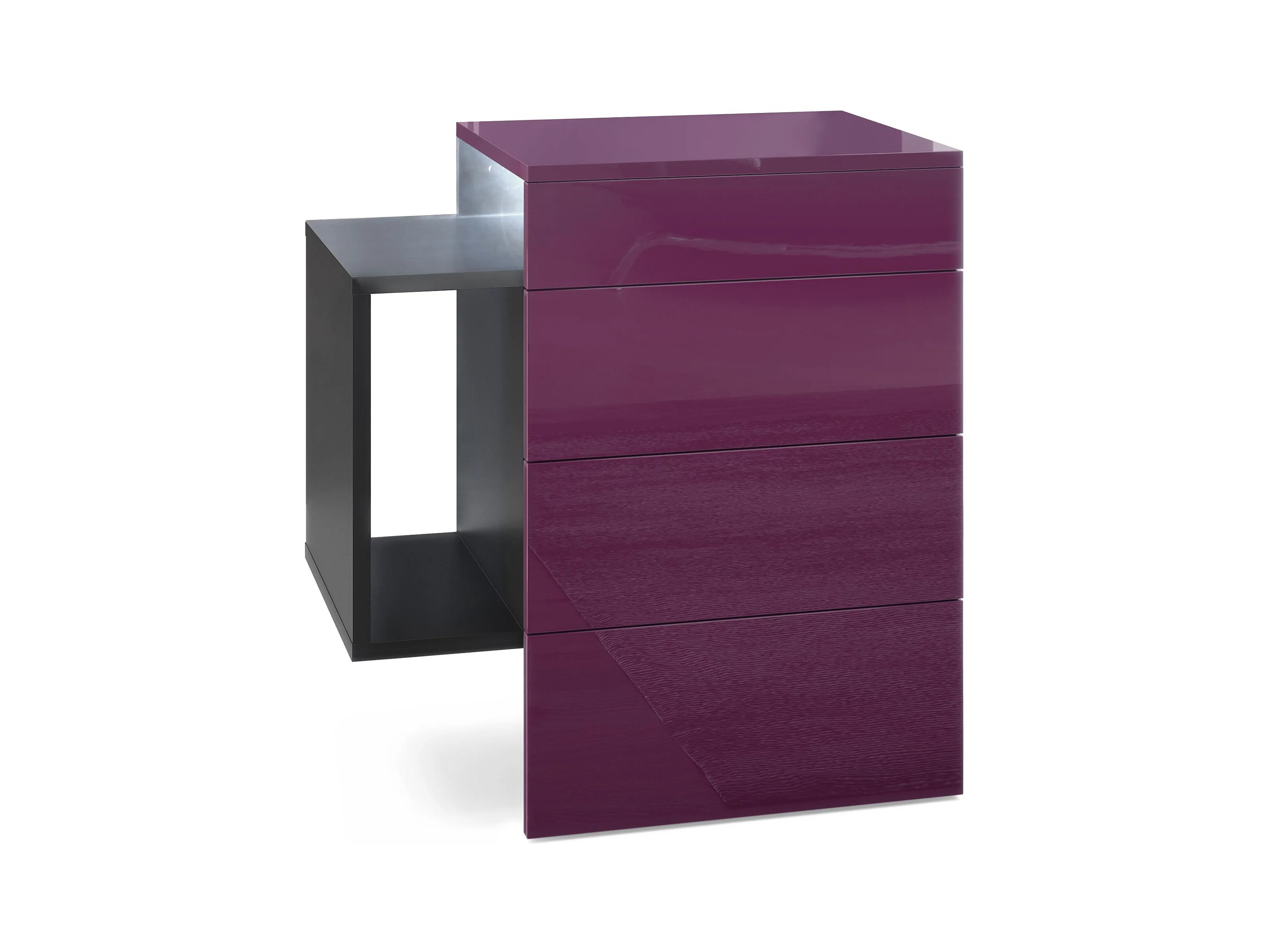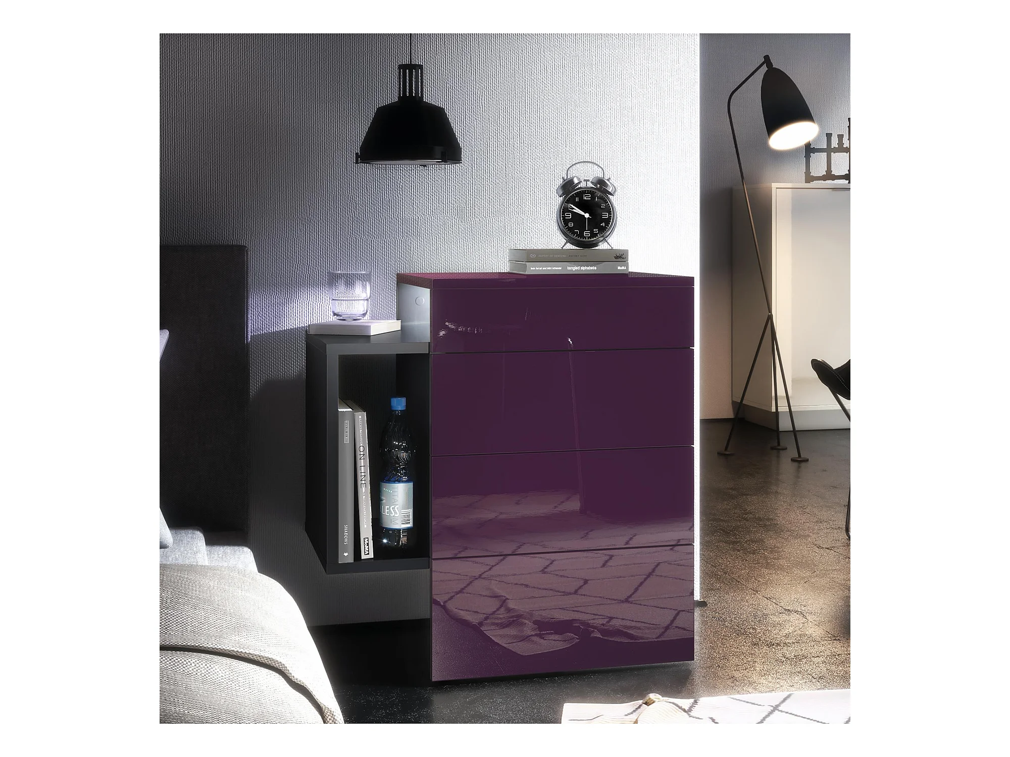 Table de chevet Queens, Table de nuit avec 2 tiroirs et 1 compartiment latéral à fixer au mur, Noir mat/Mûre brillant, incl. LED blanc (60x63x36 cm)