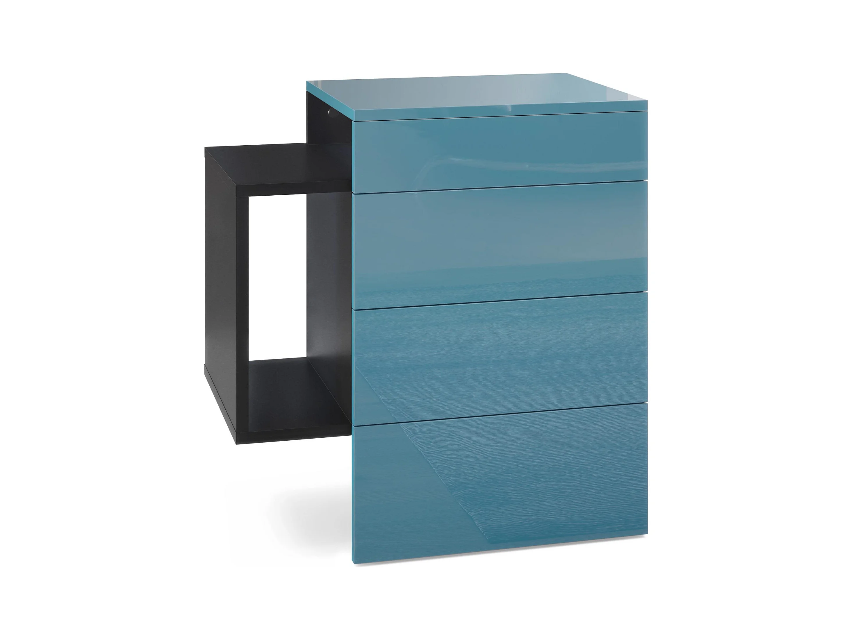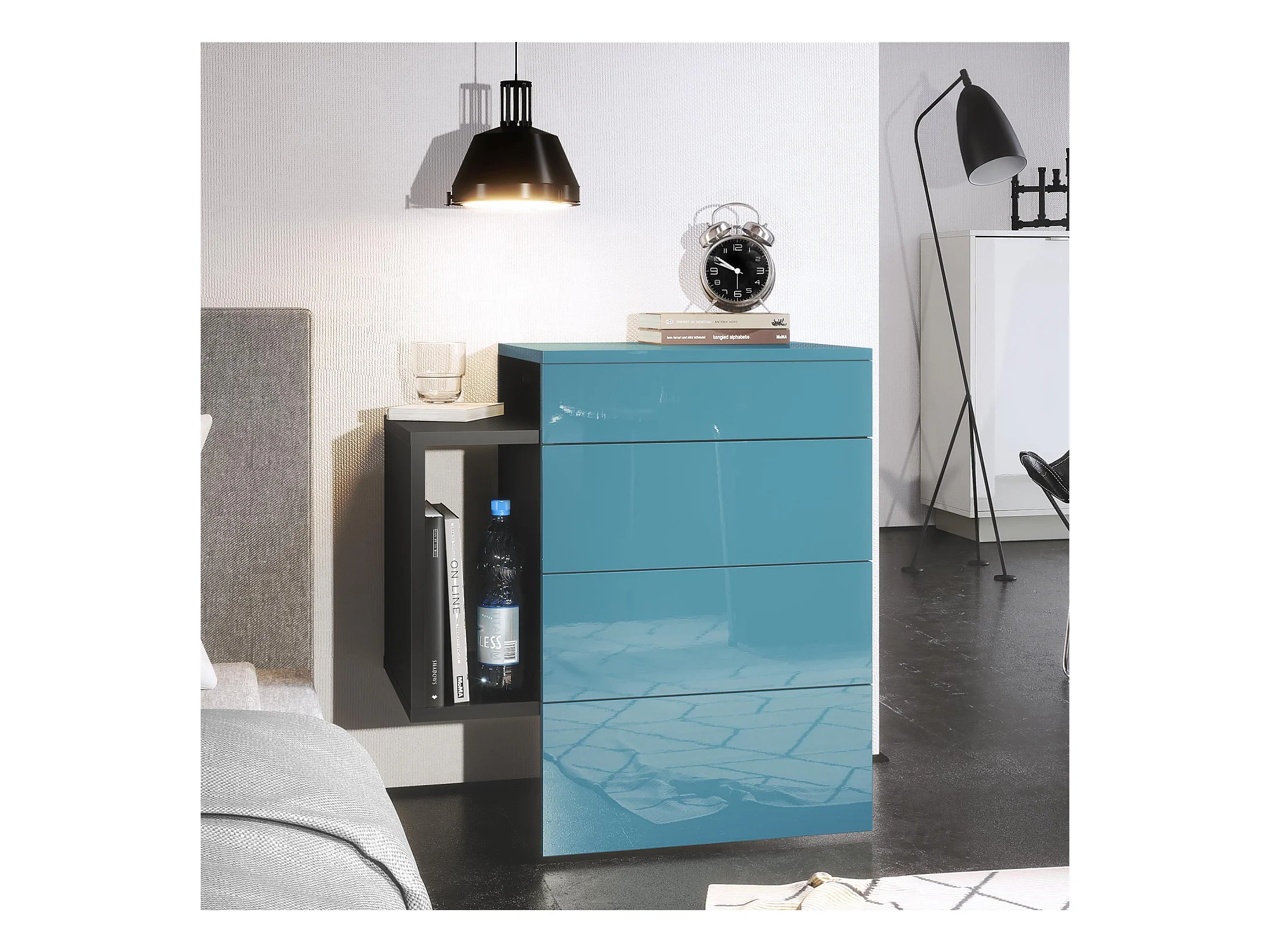 Table de chevet Queens, Table de nuit avec 2 tiroirs et 1 compartiment latéral à fixer au mur, Noir mat/Turquoise haute brillance (60 x 63 x 36 cm)