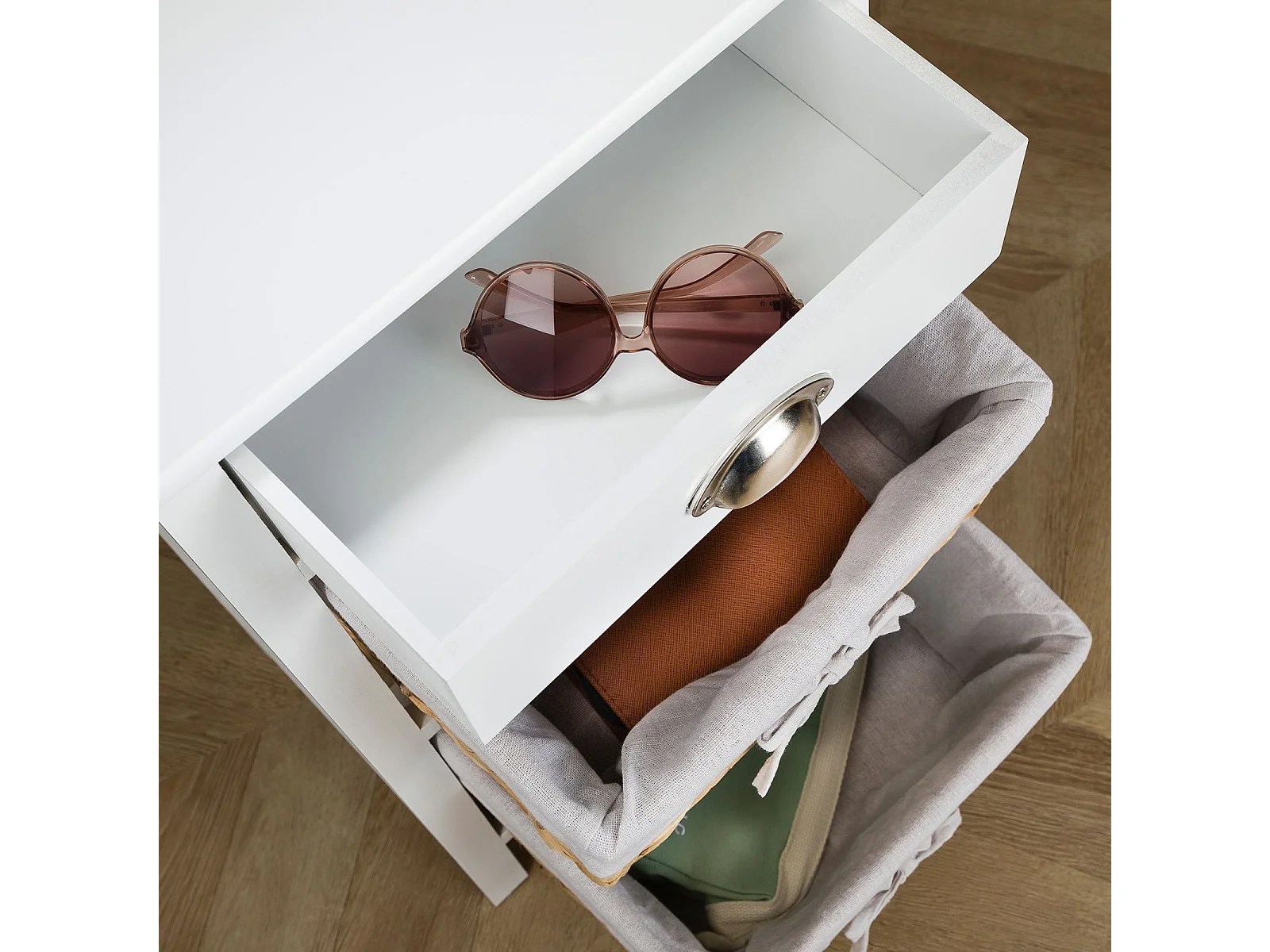 Table de chevet NUSCO table de nuit en bois lasuré blanc avec 1 tiroir et 3 paniers en fibre naturelle et insert en tissu blanc