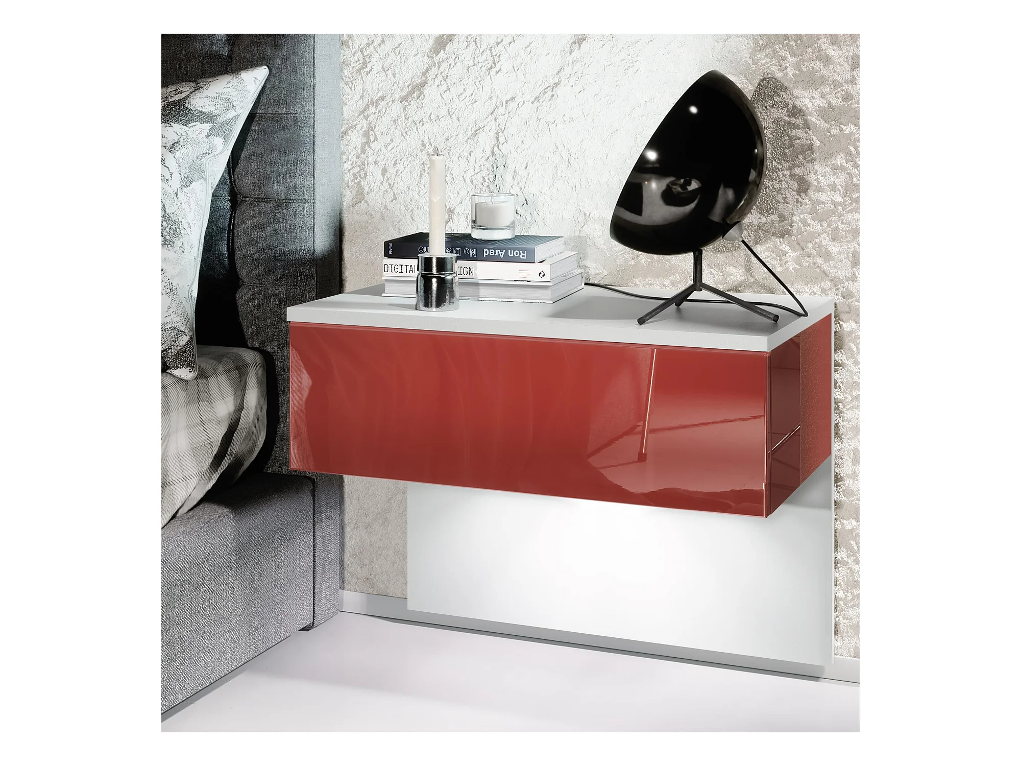 Table de chevet Sleep, Table de nuit à fixation murale avec tiroir, Blanc mat/Bordeaux haute brillance, éclairage LED inclus (60 x 46 x 35 cm)
