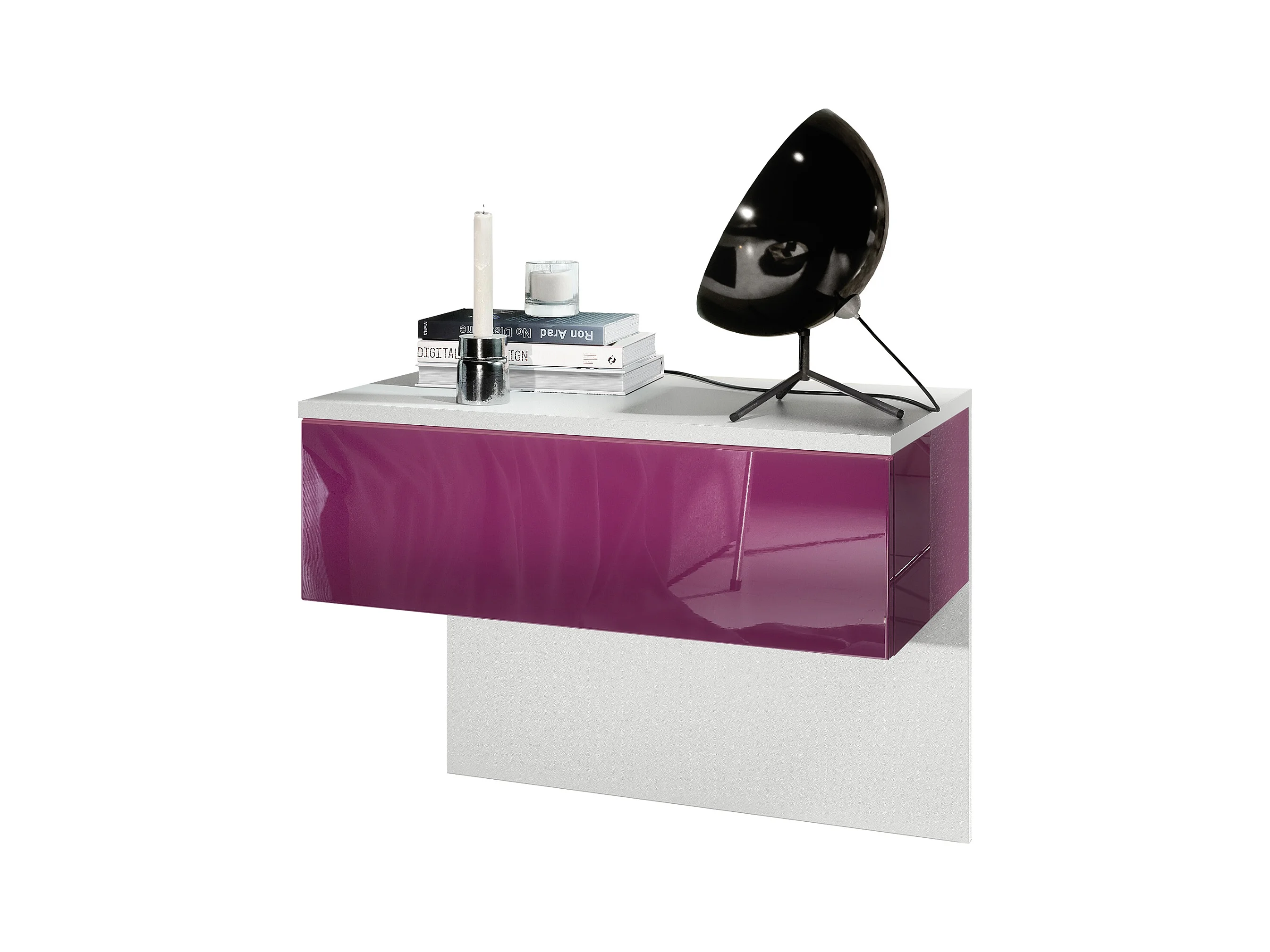 Table de chevet Sleep, Table de nuit à fixation murale avec tiroir, Blanc mat/Mûre haute brillance (60 x 46 x 35 cm)