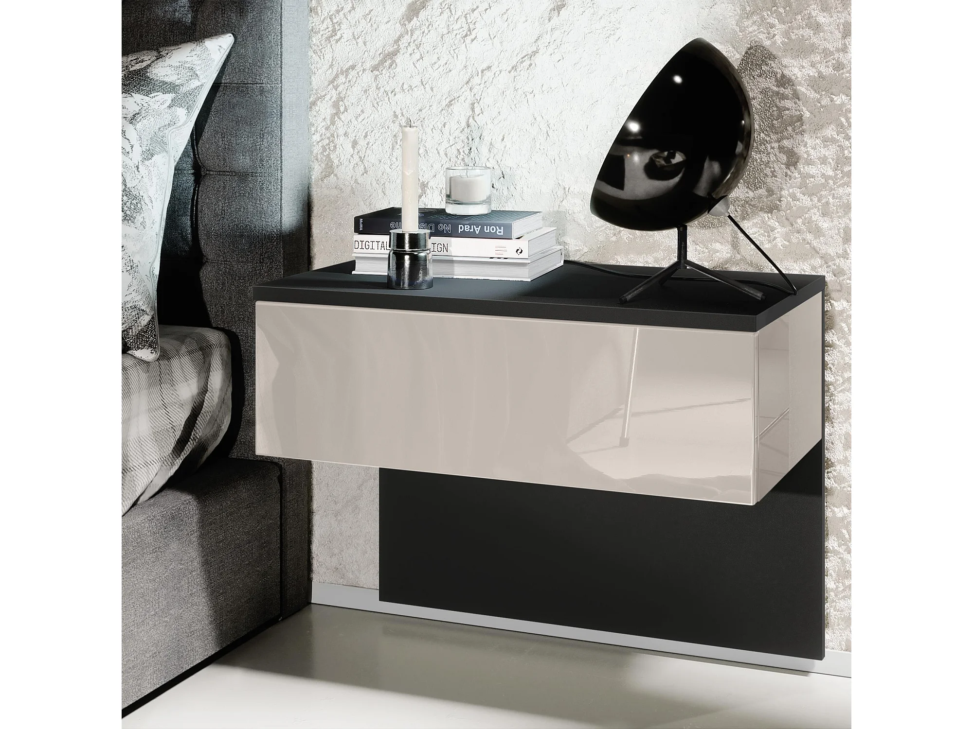 Table de chevet Sleep, Table de nuit à fixation murale avec tiroir, Noir mat/Gris sable haute brillance (60 x 46 x 35 cm)