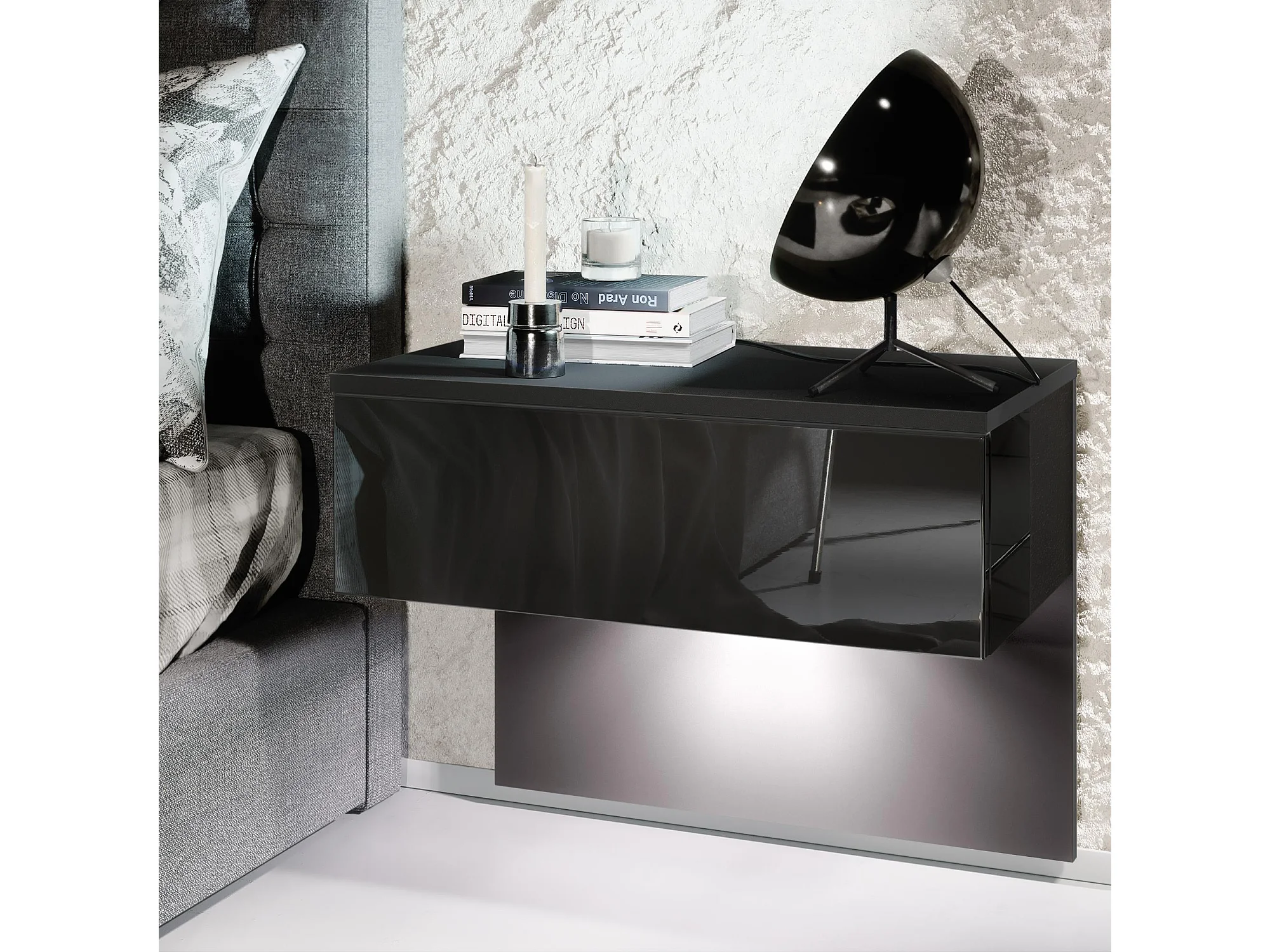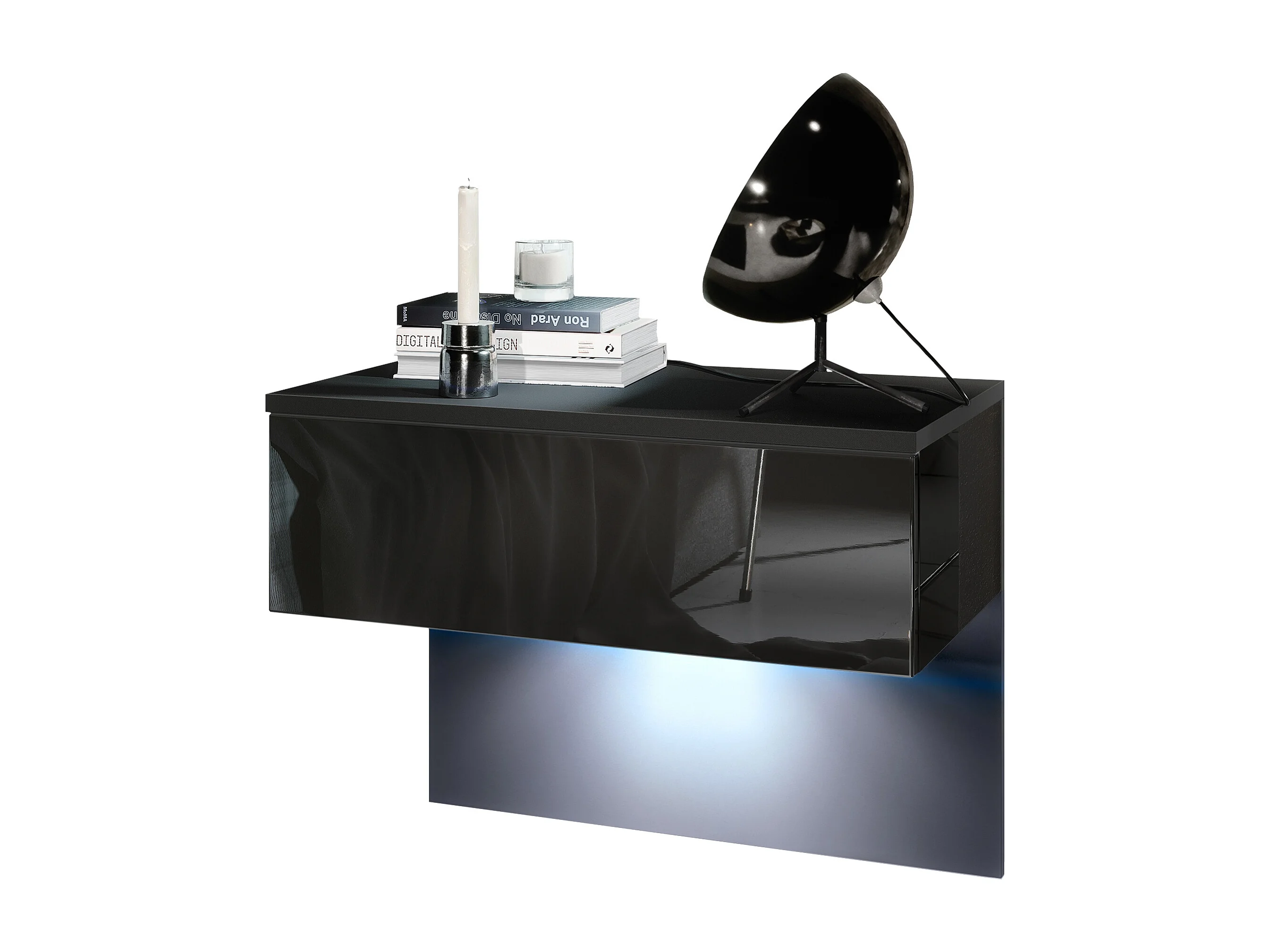 Table de chevet Sleep, Table de nuit à fixation murale avec tiroir, Noir mat/Noir haute brillance, éclairage LED inclus (60 x 46 x 35 cm)