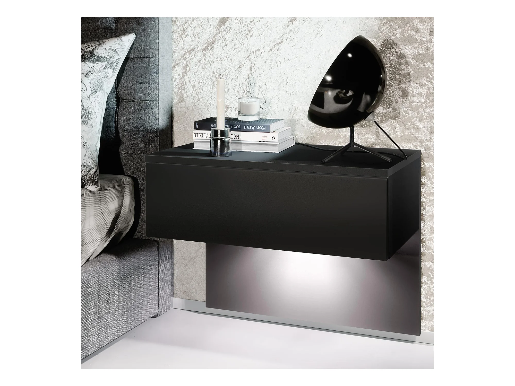 Table de chevet Sleep, Table de nuit à fixation murale avec tiroir, Noir mat/Noir mat, éclairage LED inclus (60 x 46 x 35 cm)
