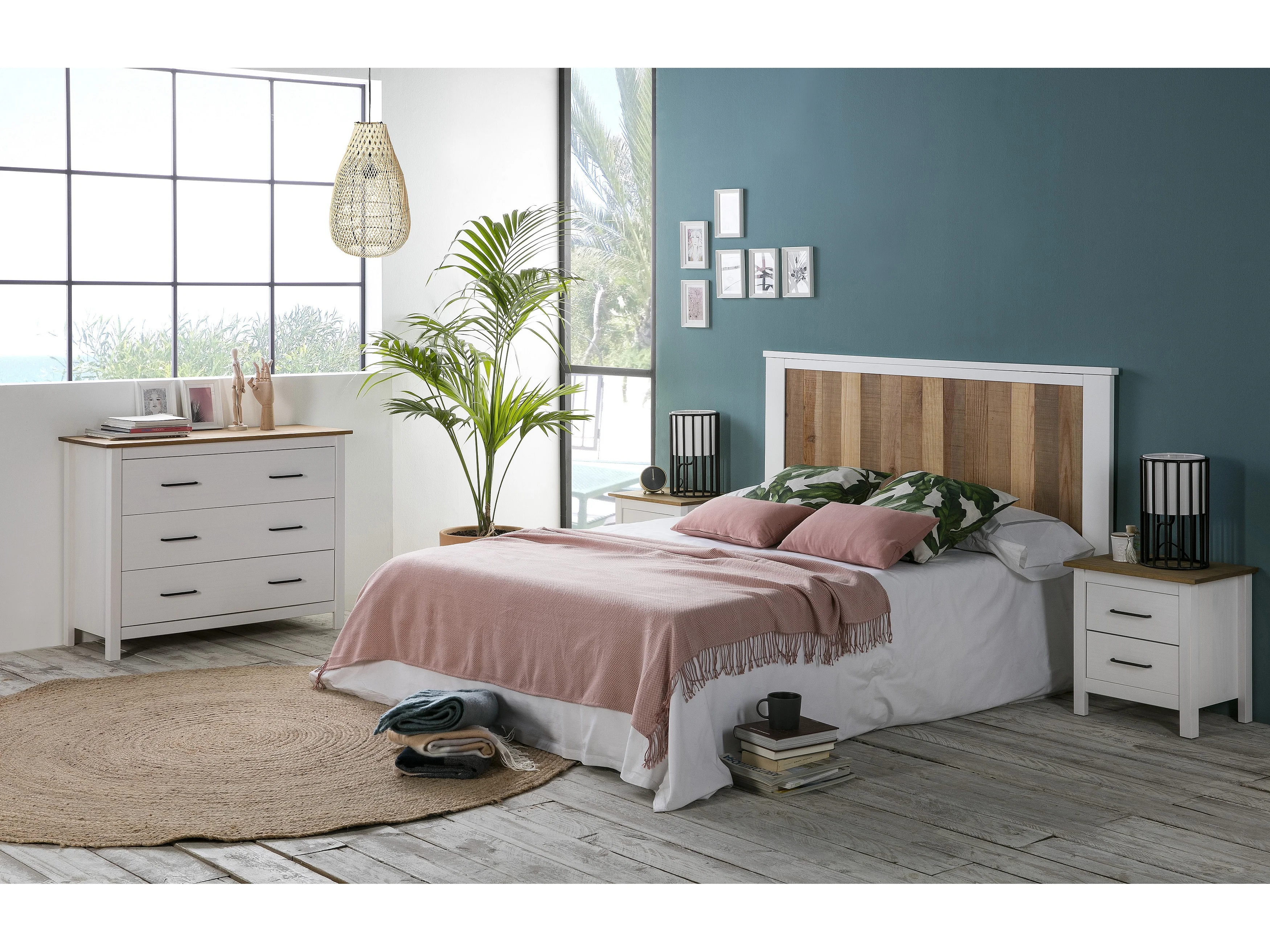 Chevet table de nuit design scandinave 2 tiroirs piètement bois pin panneaux particules blanc