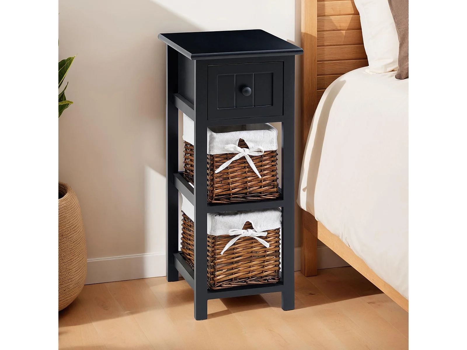 Table de chevet TALASI avec tiroir et deux paniers en bois de paulownia 28x67x31 cm (LxHxP) - meuble de rangement chambre, noir