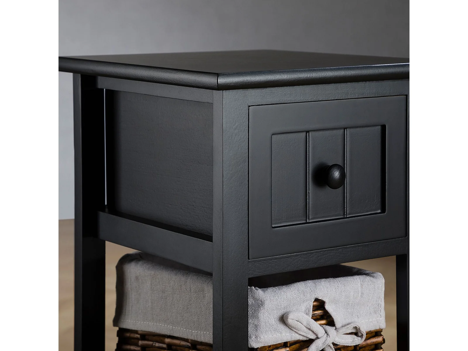 Table de chevet MESSINA table de nuit en bois noir avec 1 tiroir et 1 panier en osier et insert en tissu blanc