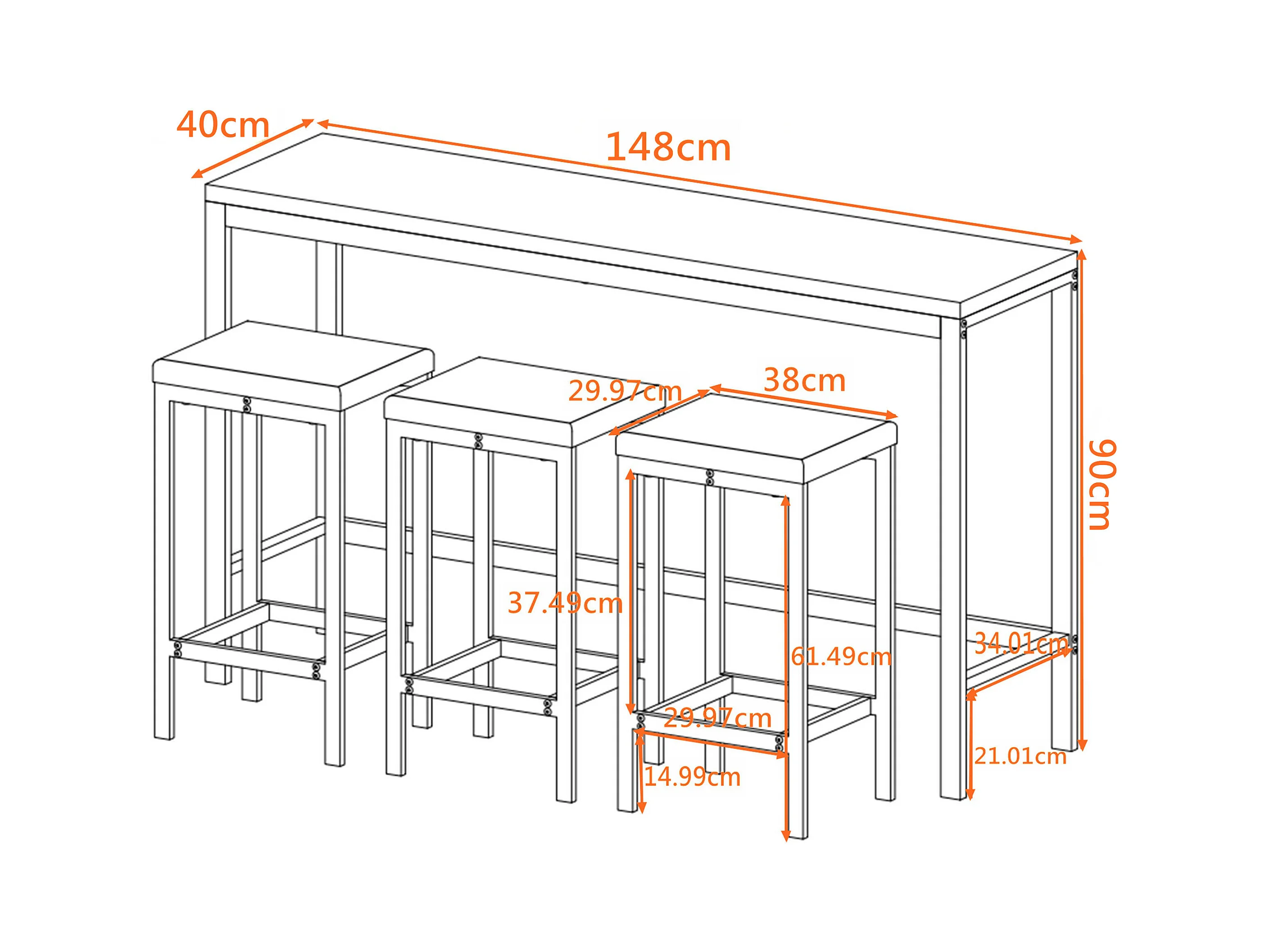 Table de Cuisine Moderne avec 3 Tabourets, Table de Bar, Table Longue en MDF et Métal, Couleur Marron Foncé (148x40x90 cm)