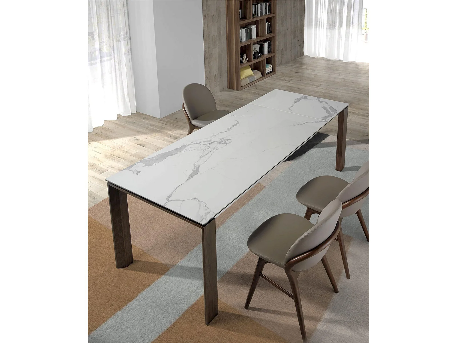 Table de diner plateau rectangulaire extensible en porcelaine et verre pieds bois