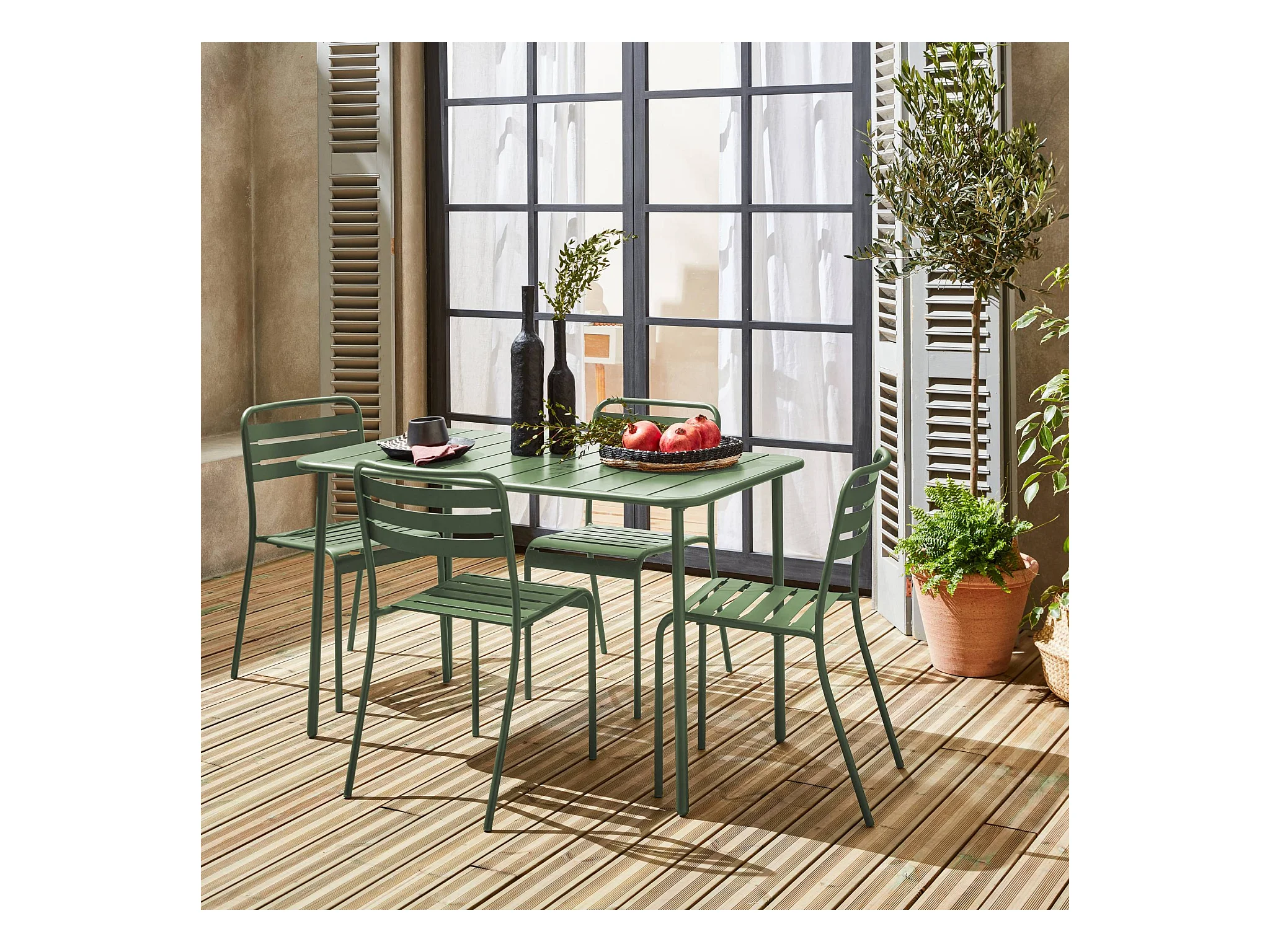 Table de jardin métal + 4 assises vert en acier. Amelia. 120 x 70 x 72.5 cm
