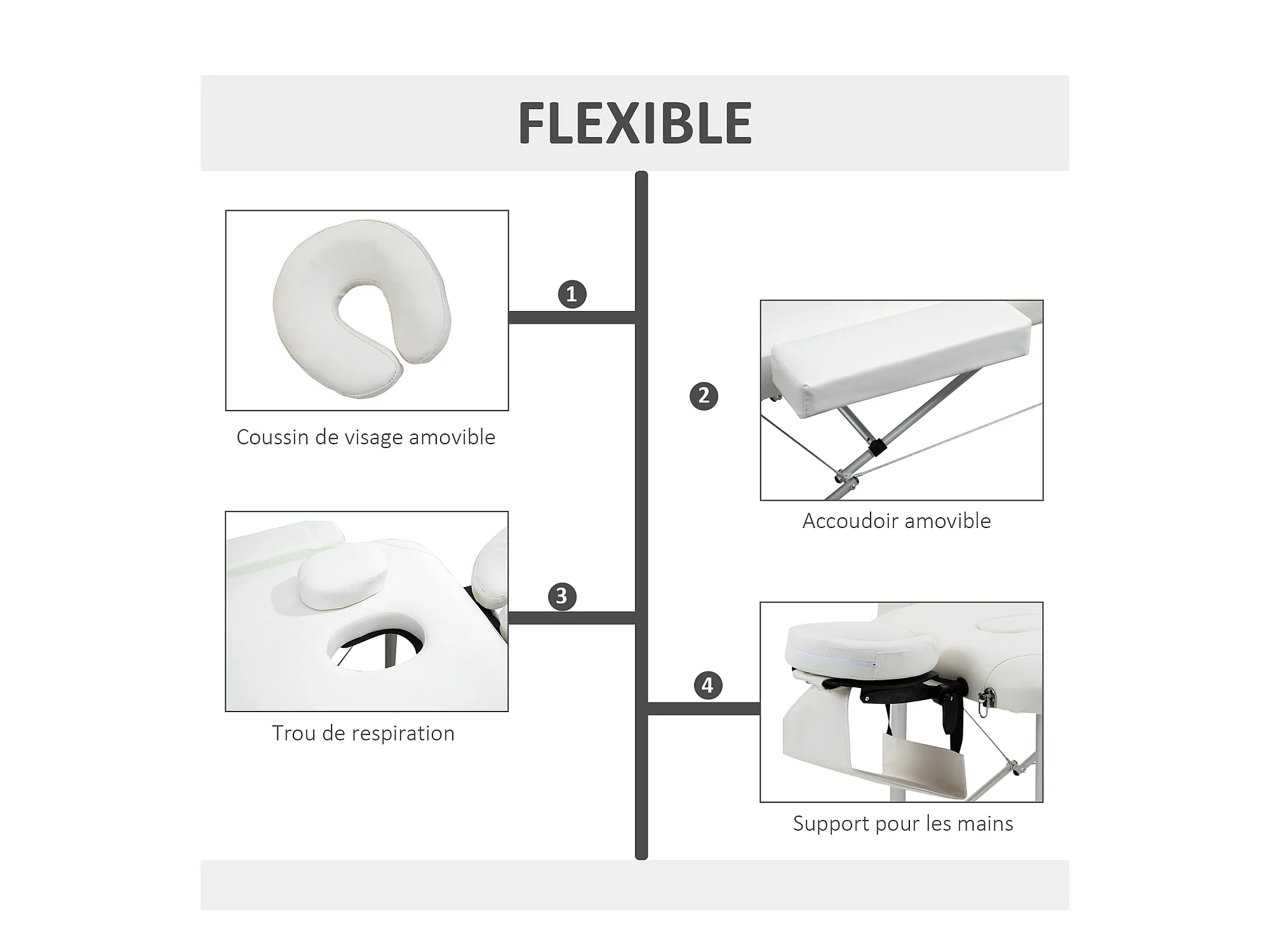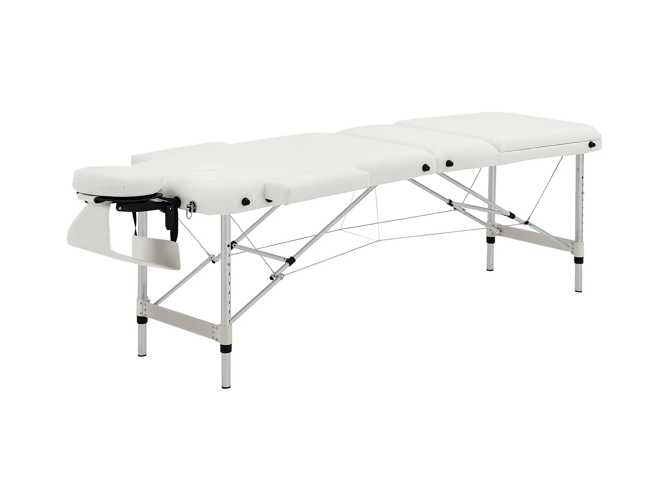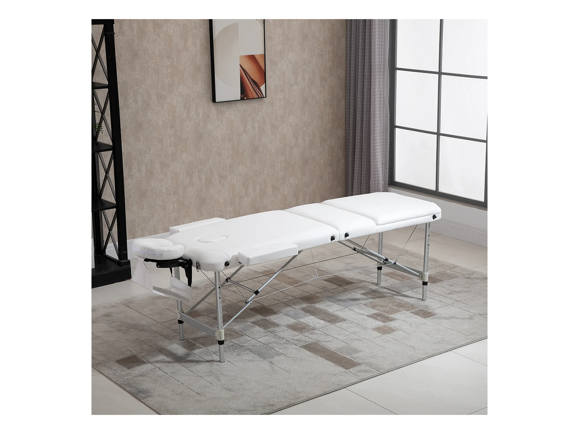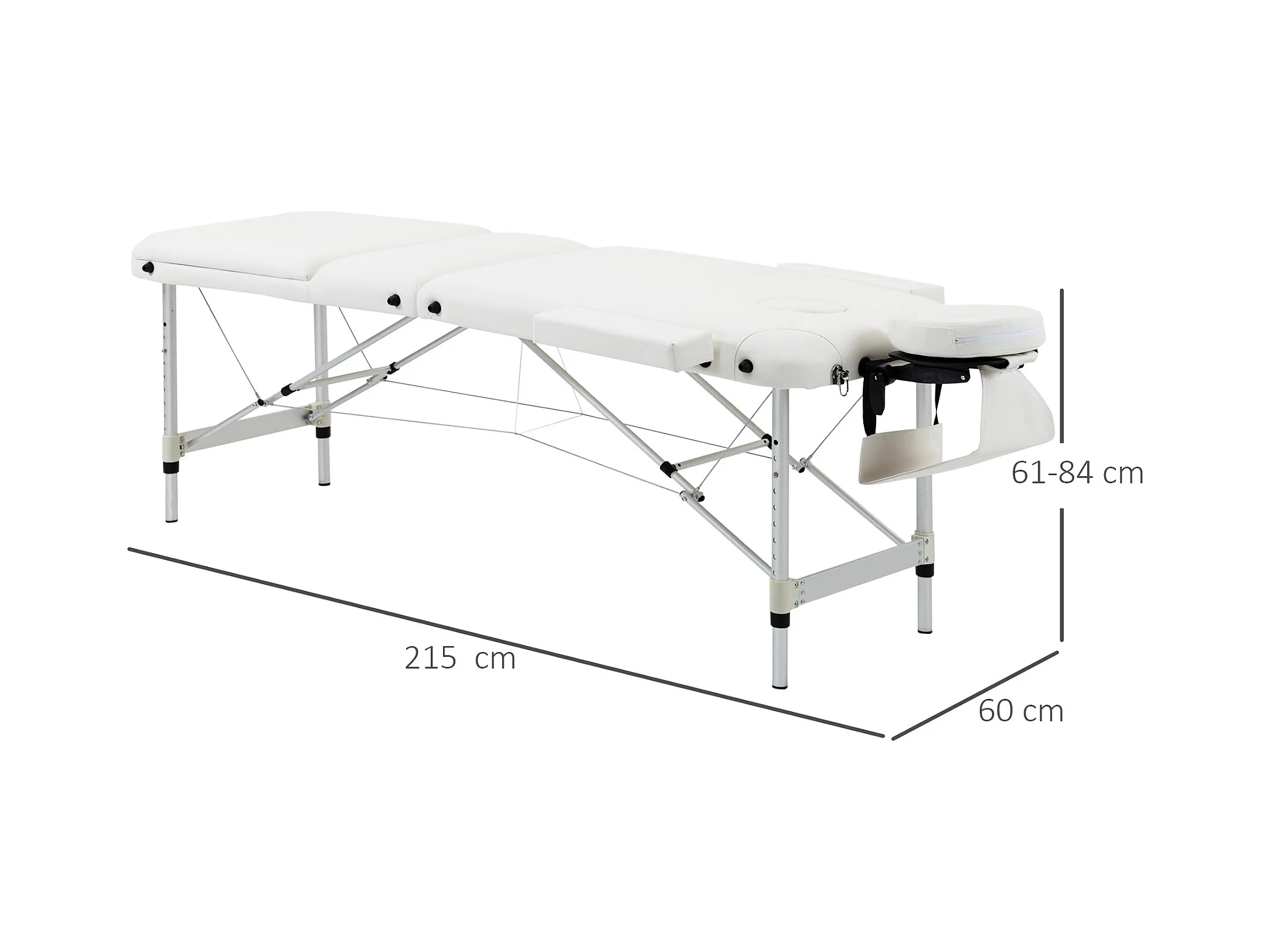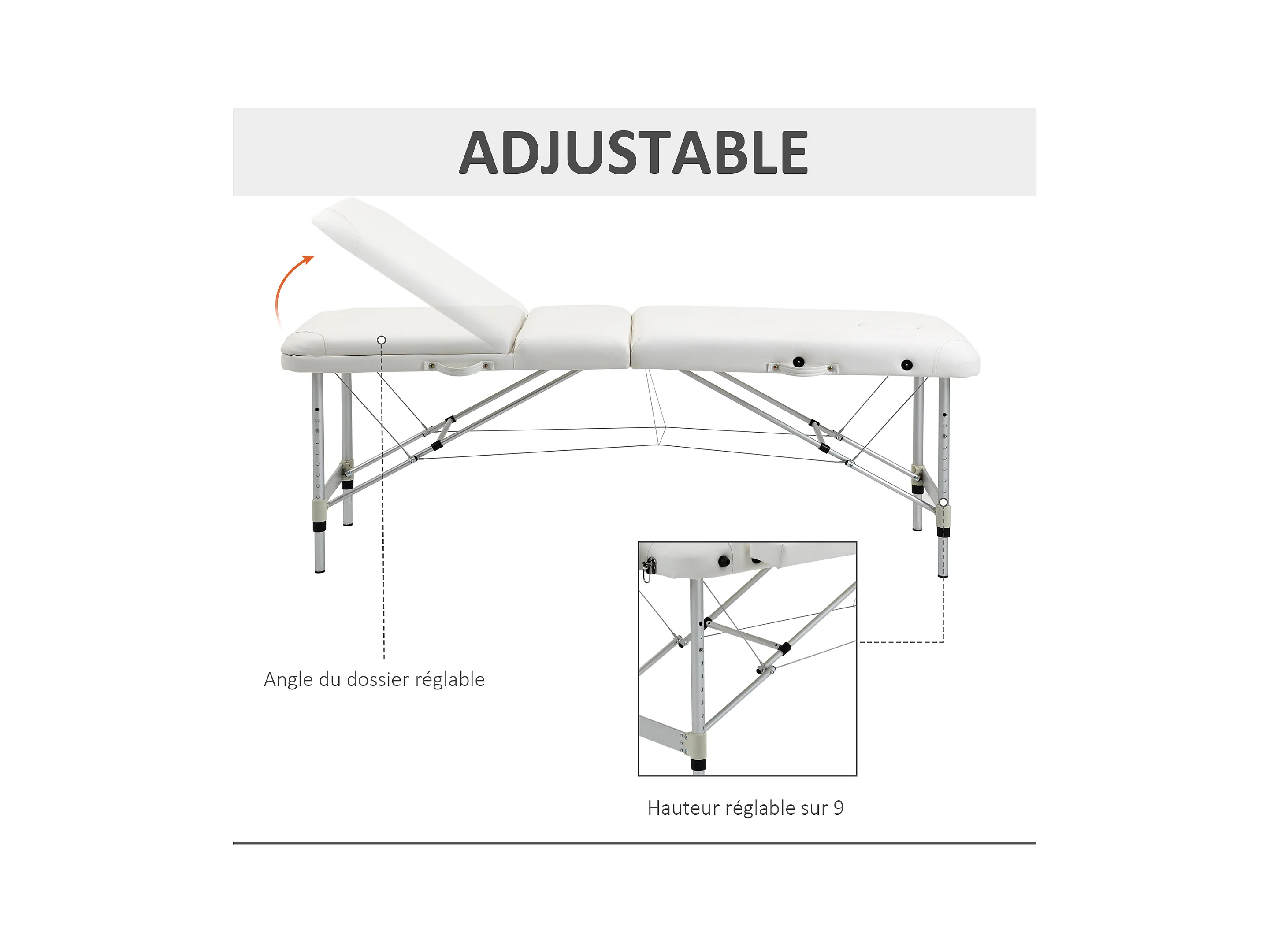 Table de massage pliable 3 zones hauteur réglable dim. 215L x 60l x 61-84H cm alu. synthétique PVC blanc