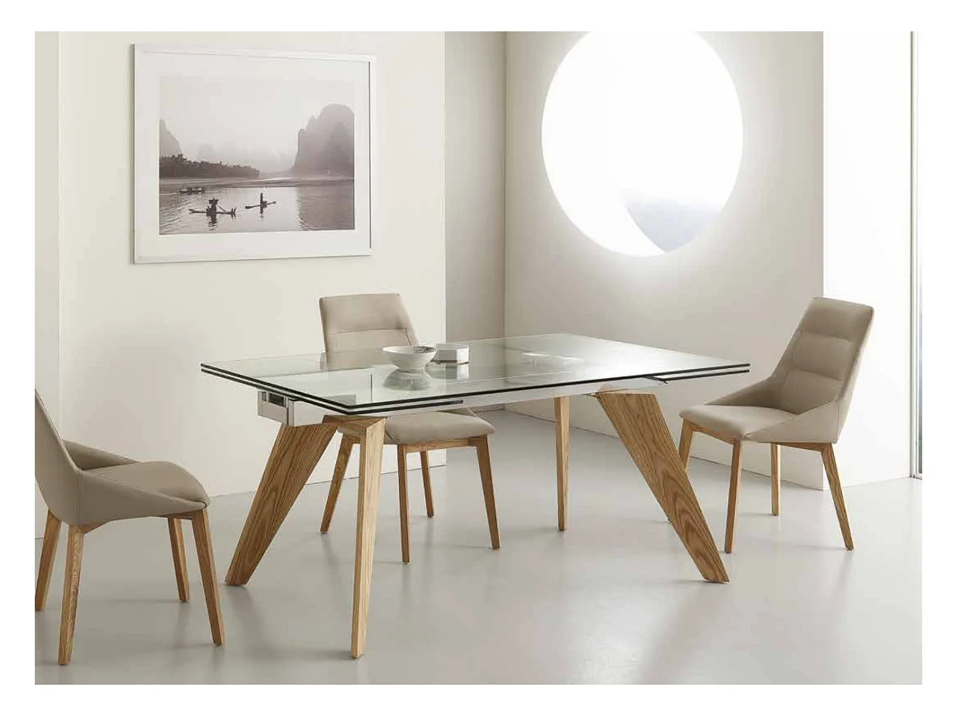 Table de repas extensible 160-240cm plateau en verre et piétement bois massif de frêne naturel Karone