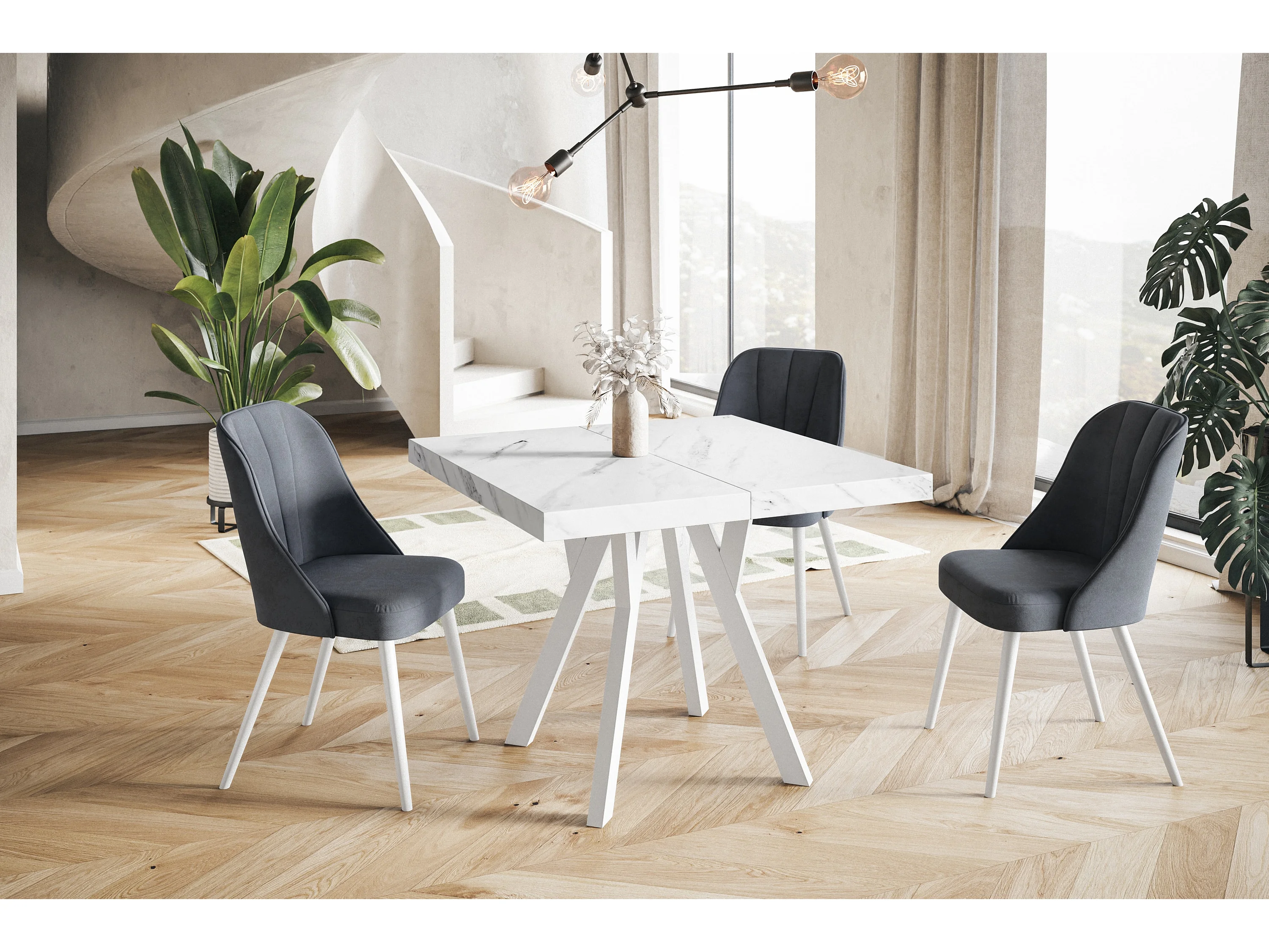 Table de salle à manger carrée RICO, table à rallonges, dimensions: 120-220X120X77 cm, couleur: MARMUR, avec pieds en bois de couleur blanche