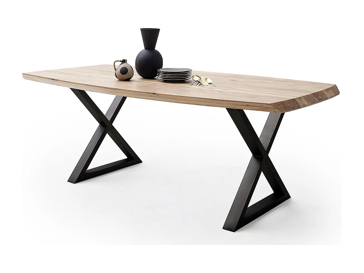Table de salle à manger rectangulaire en bois d'acacia coloris naturel, pieds croisés en métal peint anthracite - longueur 220 x hauteur 77 x profondeur 100 cm