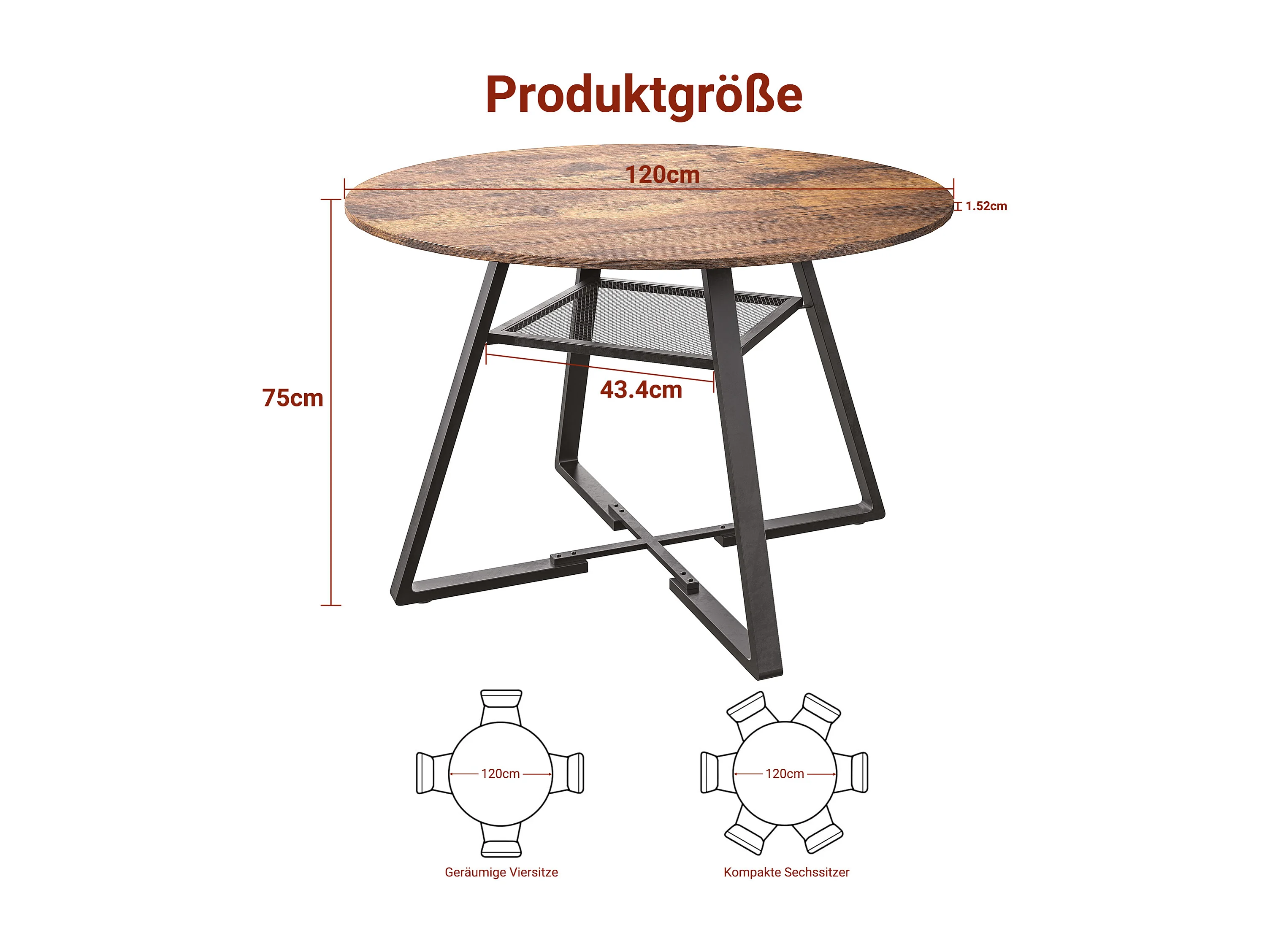 Table de Salle à Manger Ronde 120 cm,Table de Cuisine pour 4 à 6 Personnes,Surface en Bois et Base en Métal,pour Cuisine et Salon,Marron et Noir