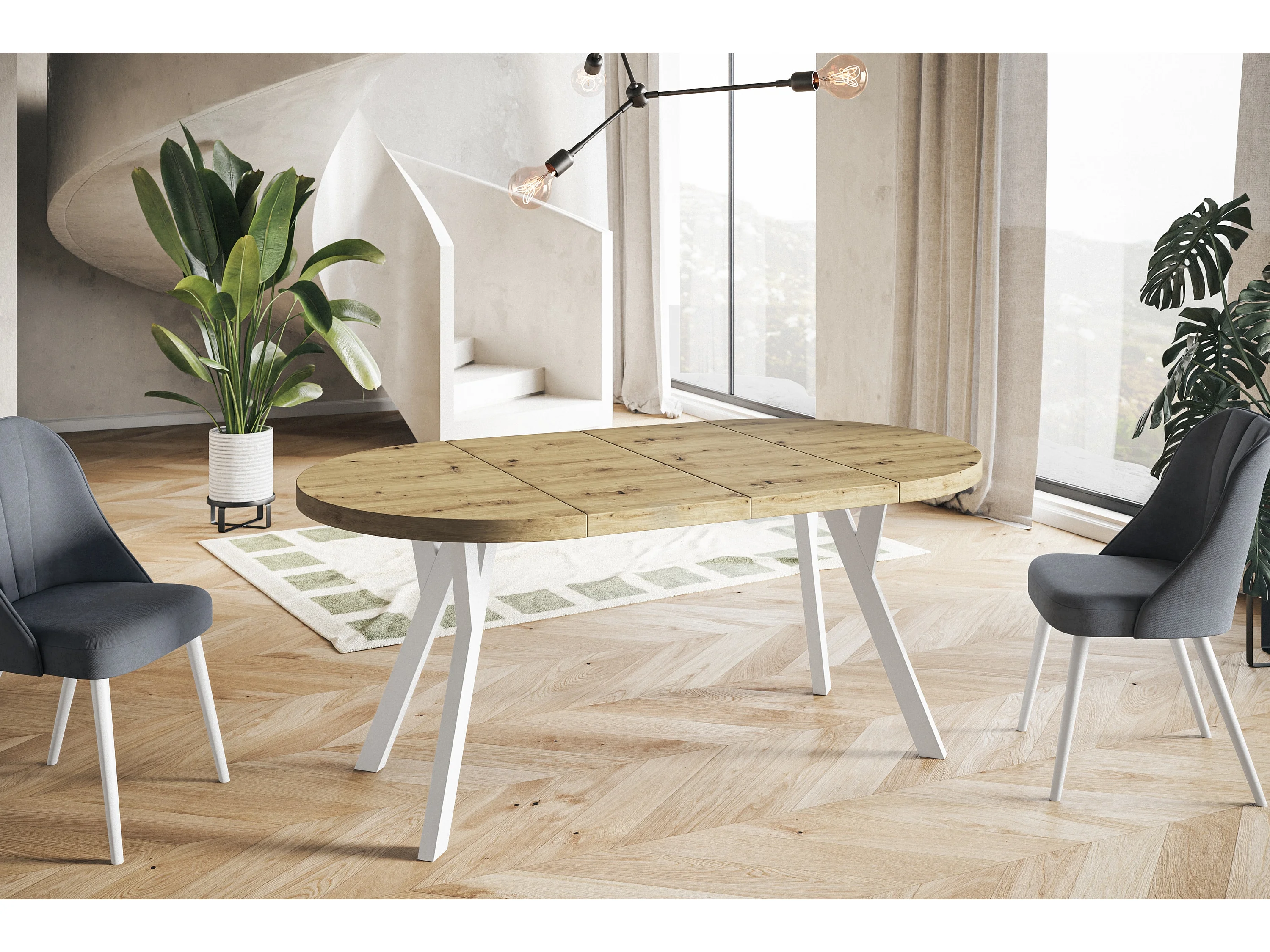 Table de salle à manger ronde OVO, table à rallonges Diamètre : 120 cm à 220 cm, couleur de la table basse : ARTISAN, avec pieds en bois de couleur blanche