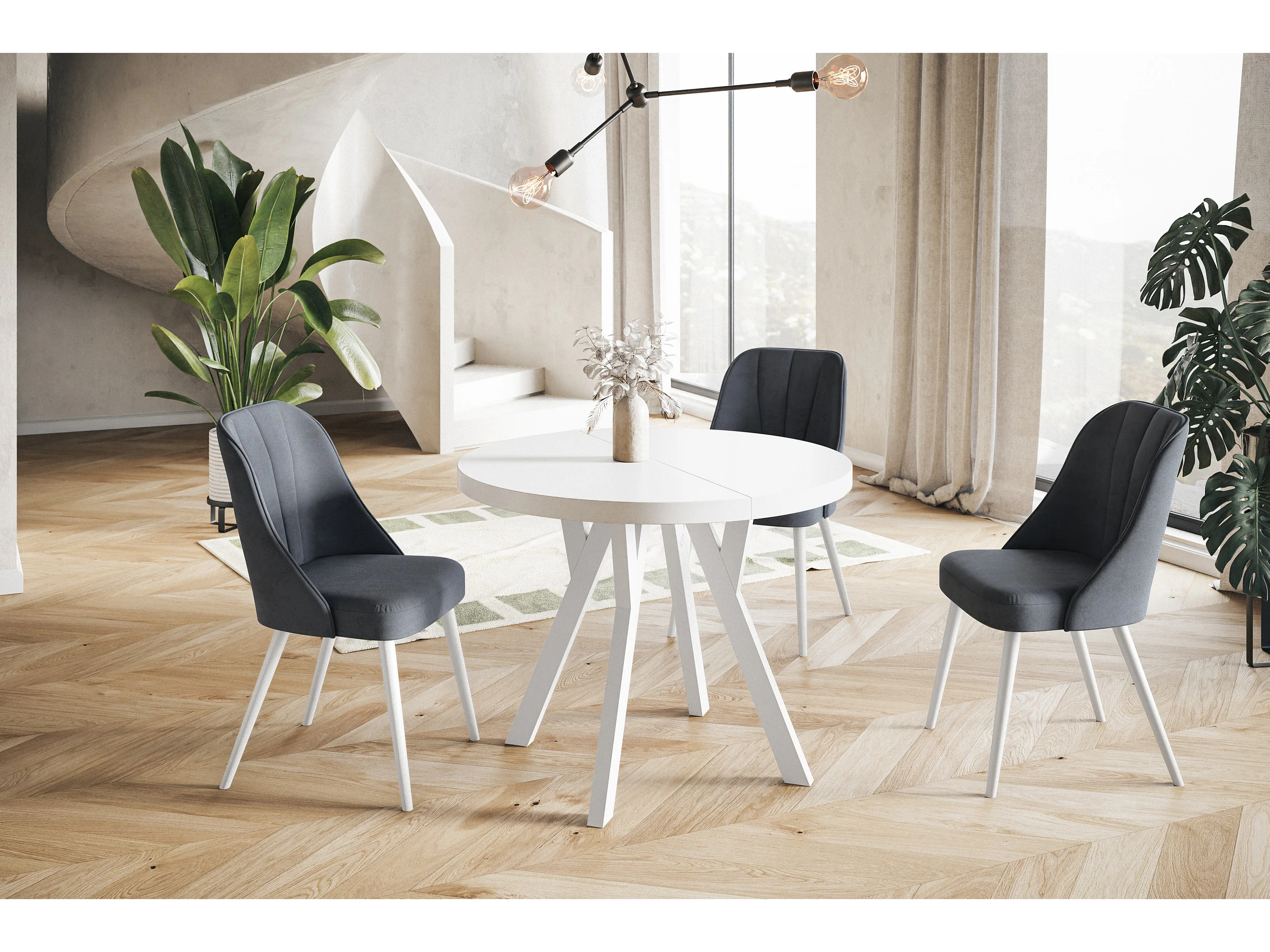Table de salle à manger ronde OVO, table à rallonges Diamètre : 120 cm à 220 cm, couleur de la table basse : blanc, avec pieds en bois couleur blanc