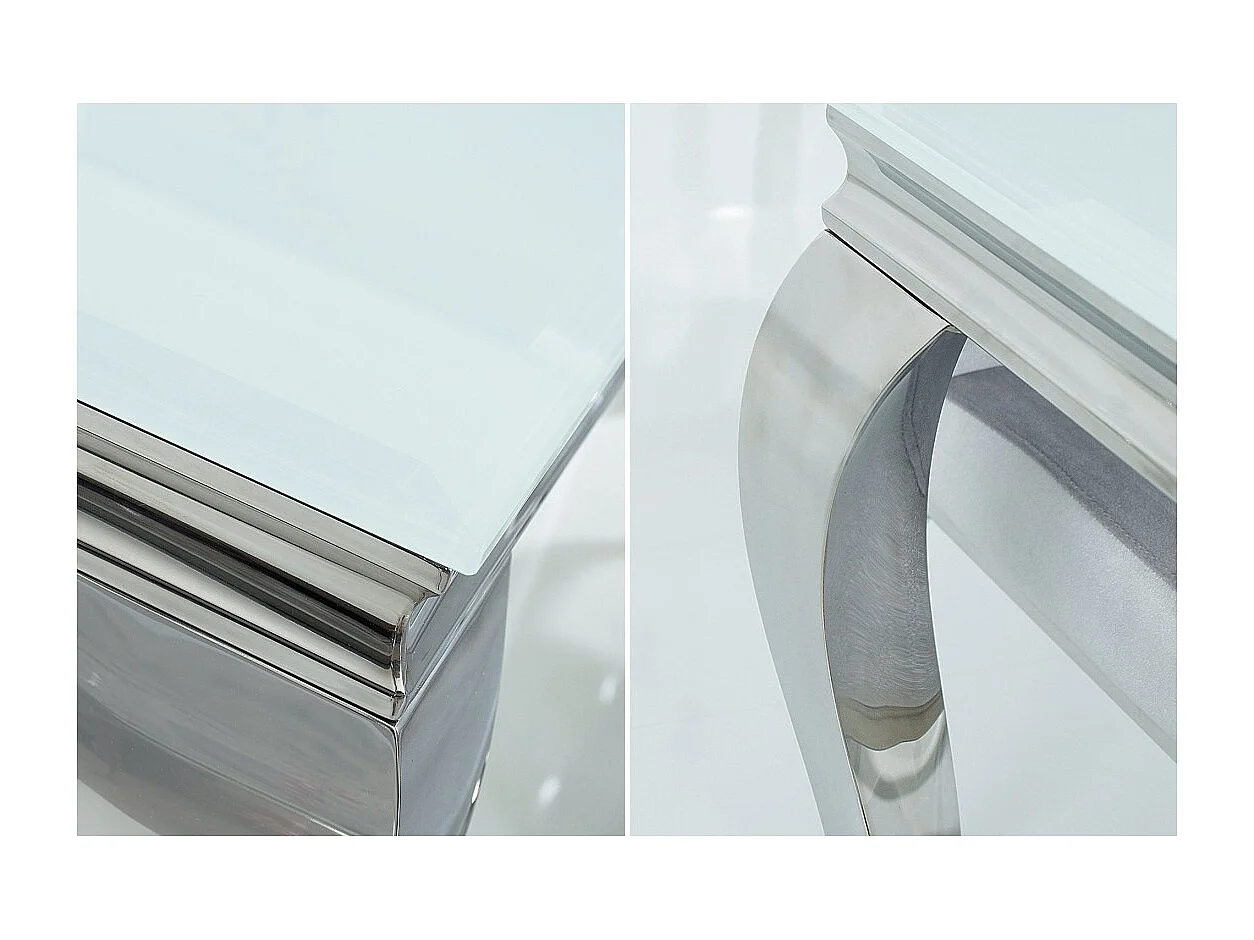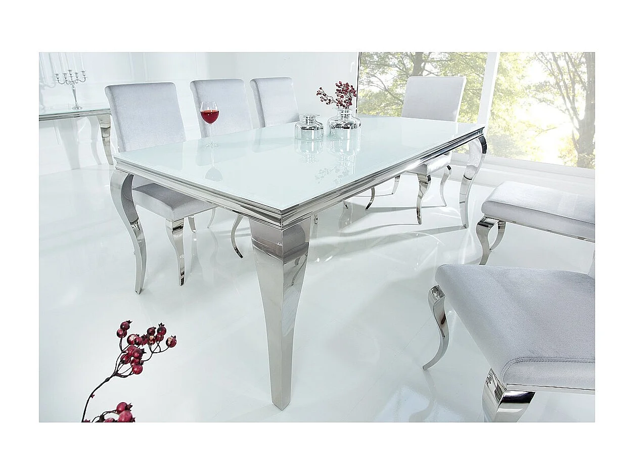 Table de salle à manger VELENA – Acier argenté et verre opale – 200 cm – Style baroque moderne