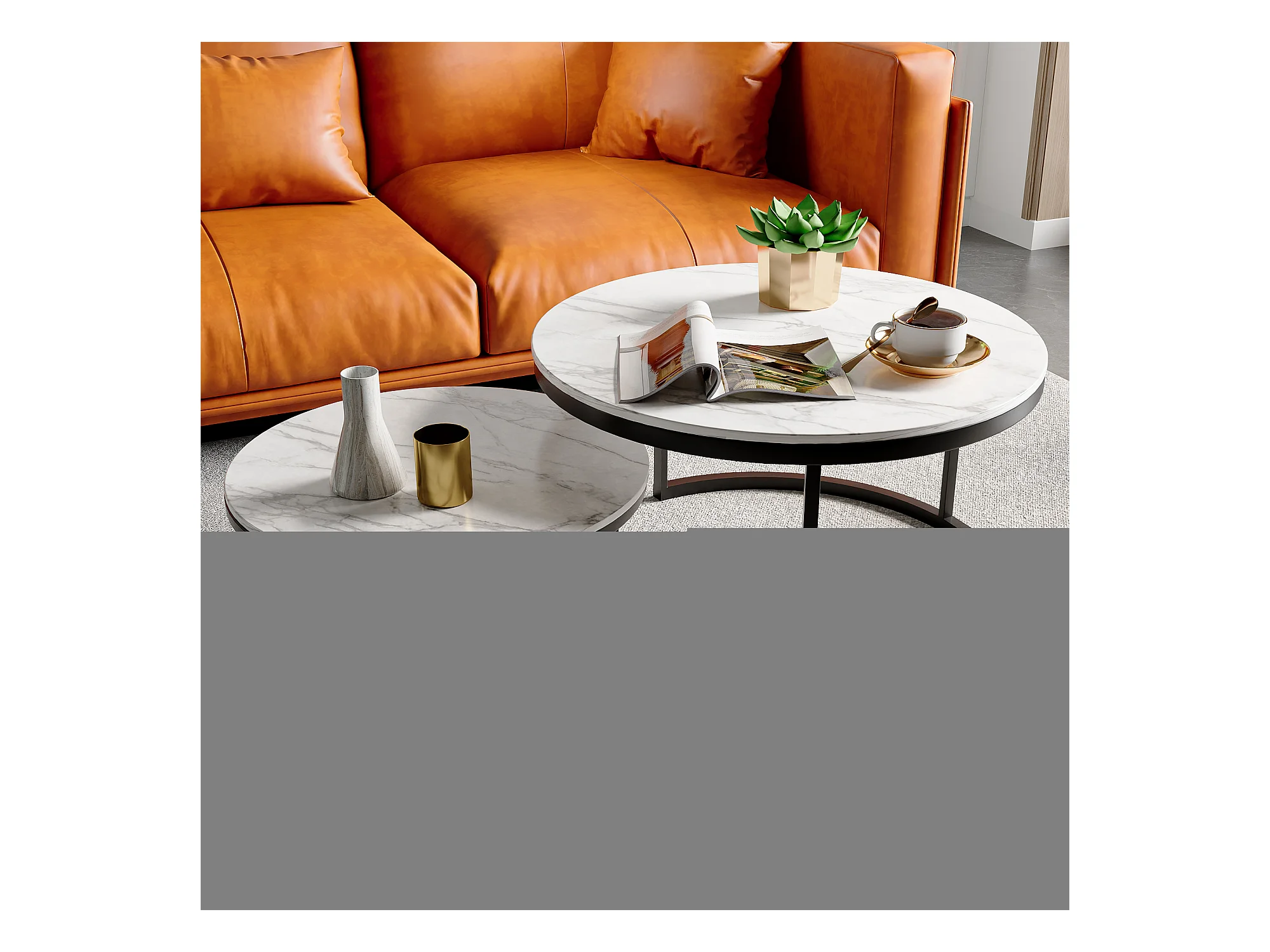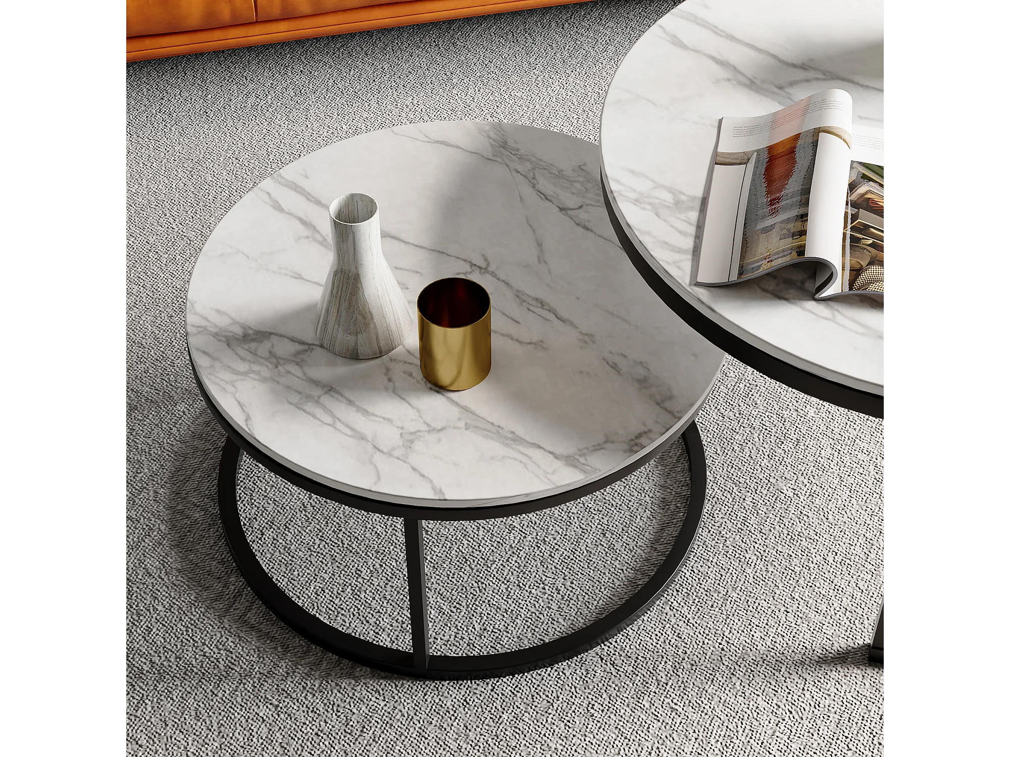 Lot de 2 tables basses tables d'appoint gigognes en acier et plateau MDF aspect marbre - table ronde et ovale - noir