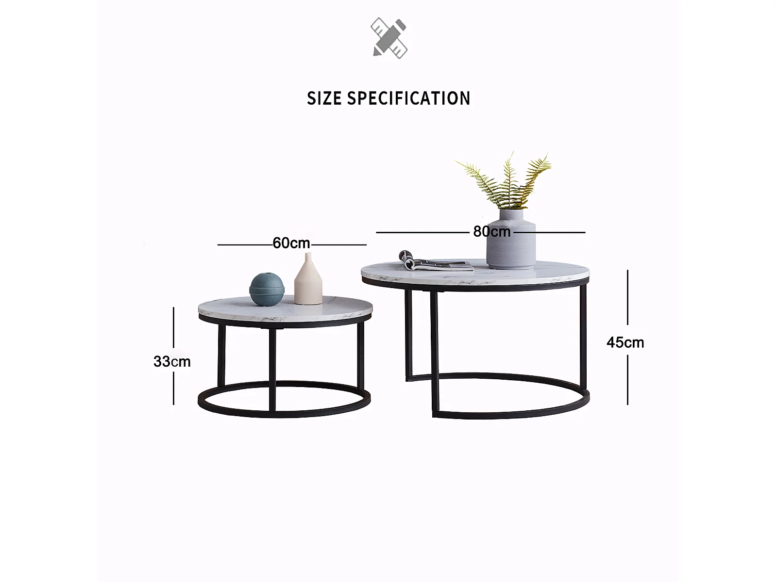 Lot de 2 Tables Basses Rondes gigogne empilables Plateau en bois aspect marbre et Pieds en métal Noir