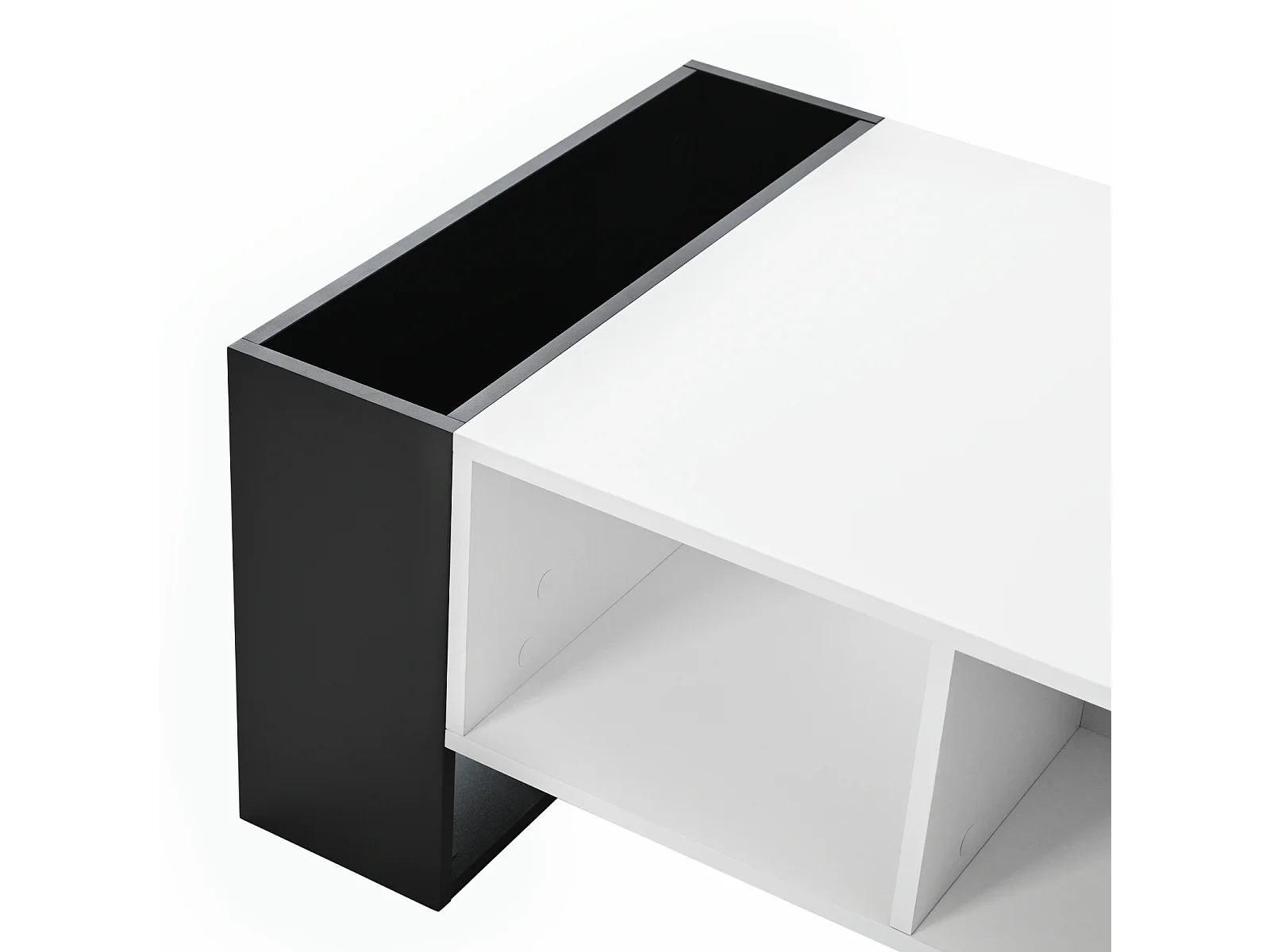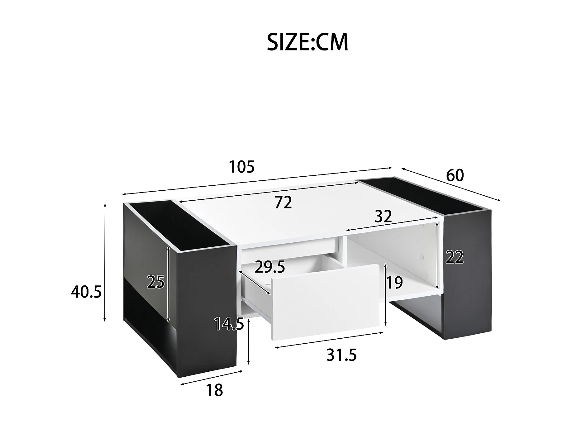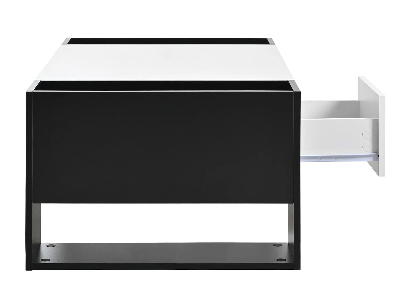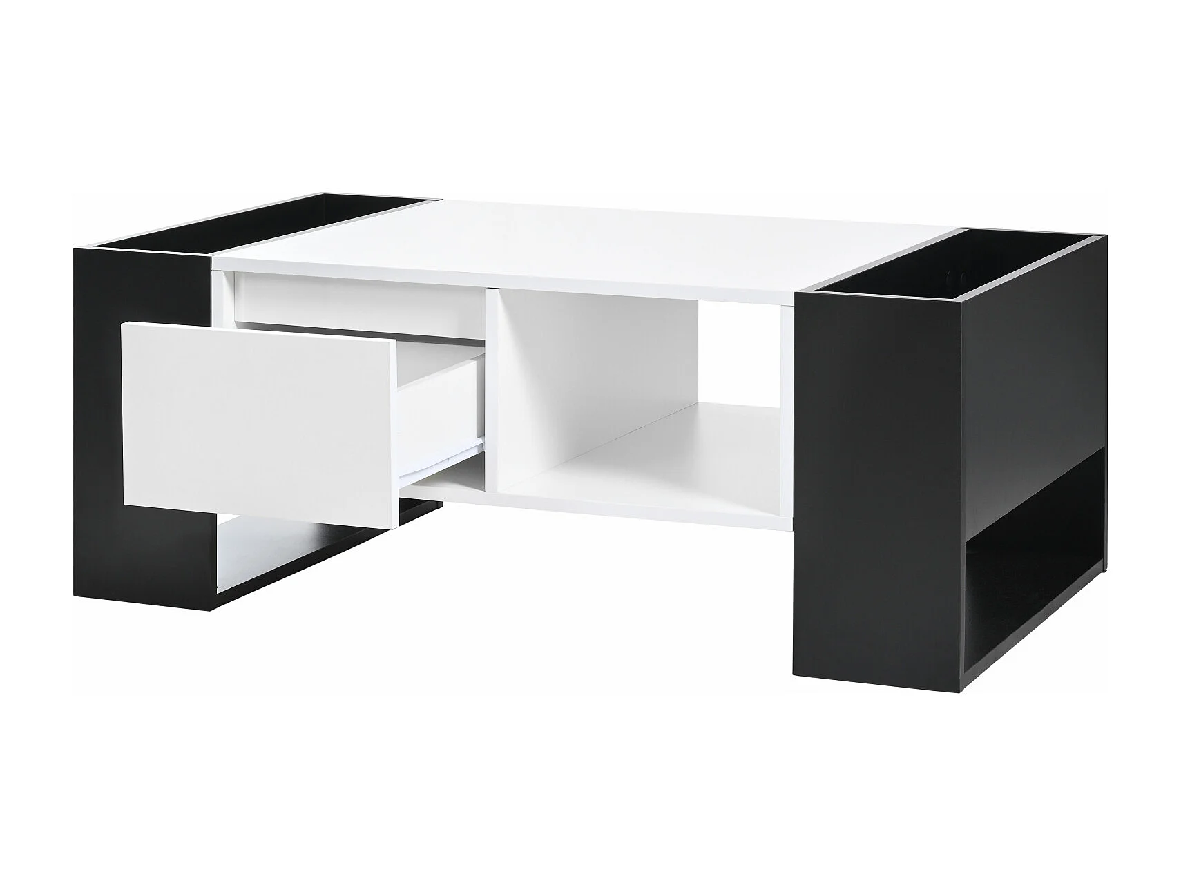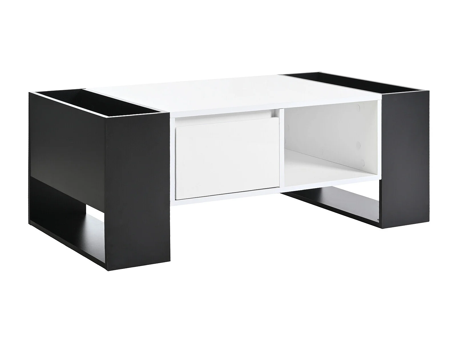 Table de salon avec tiroir, table basse avec espace de rangement, blanc et noir