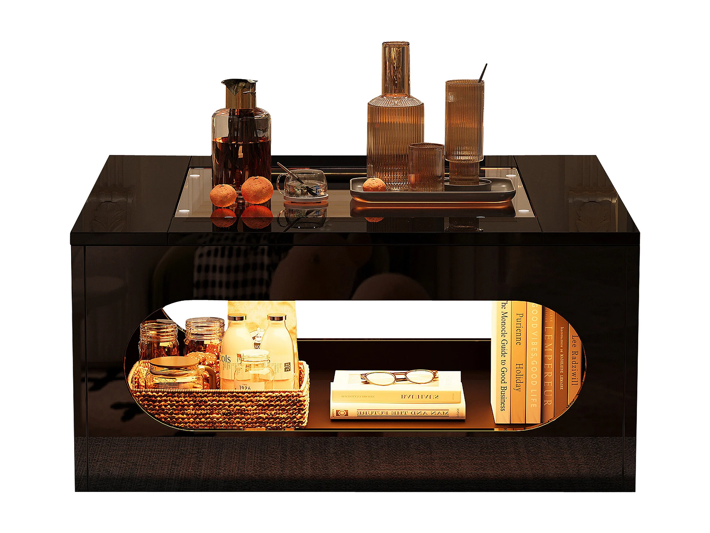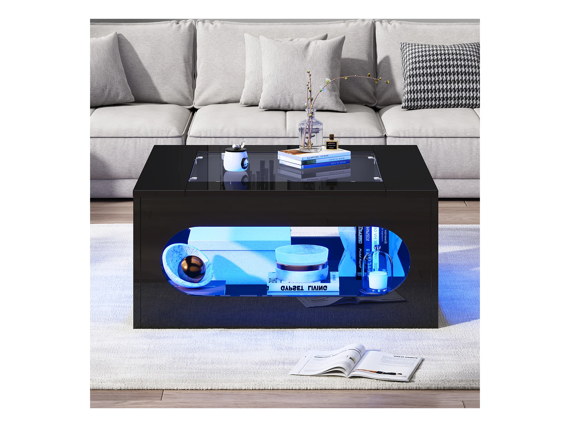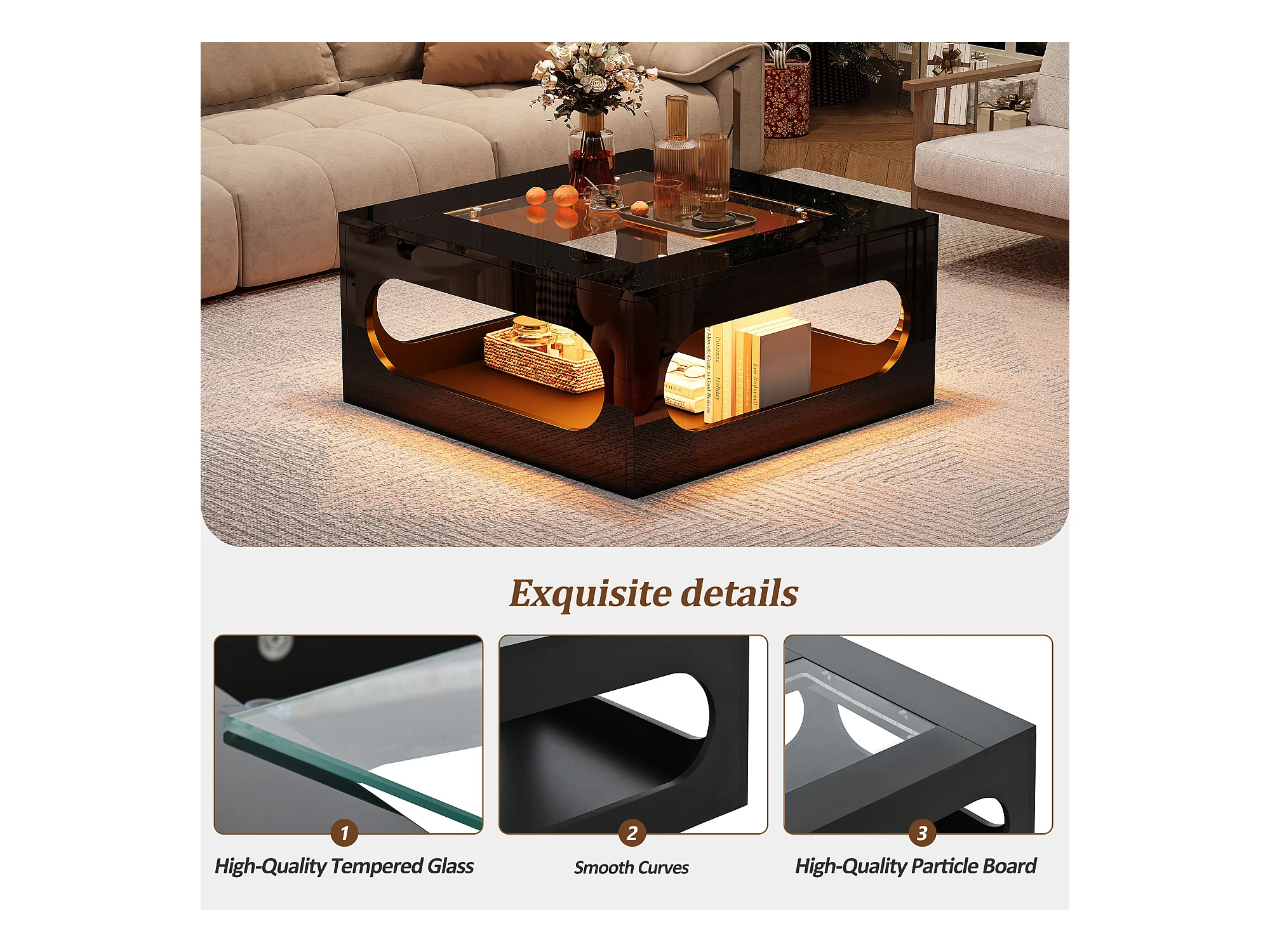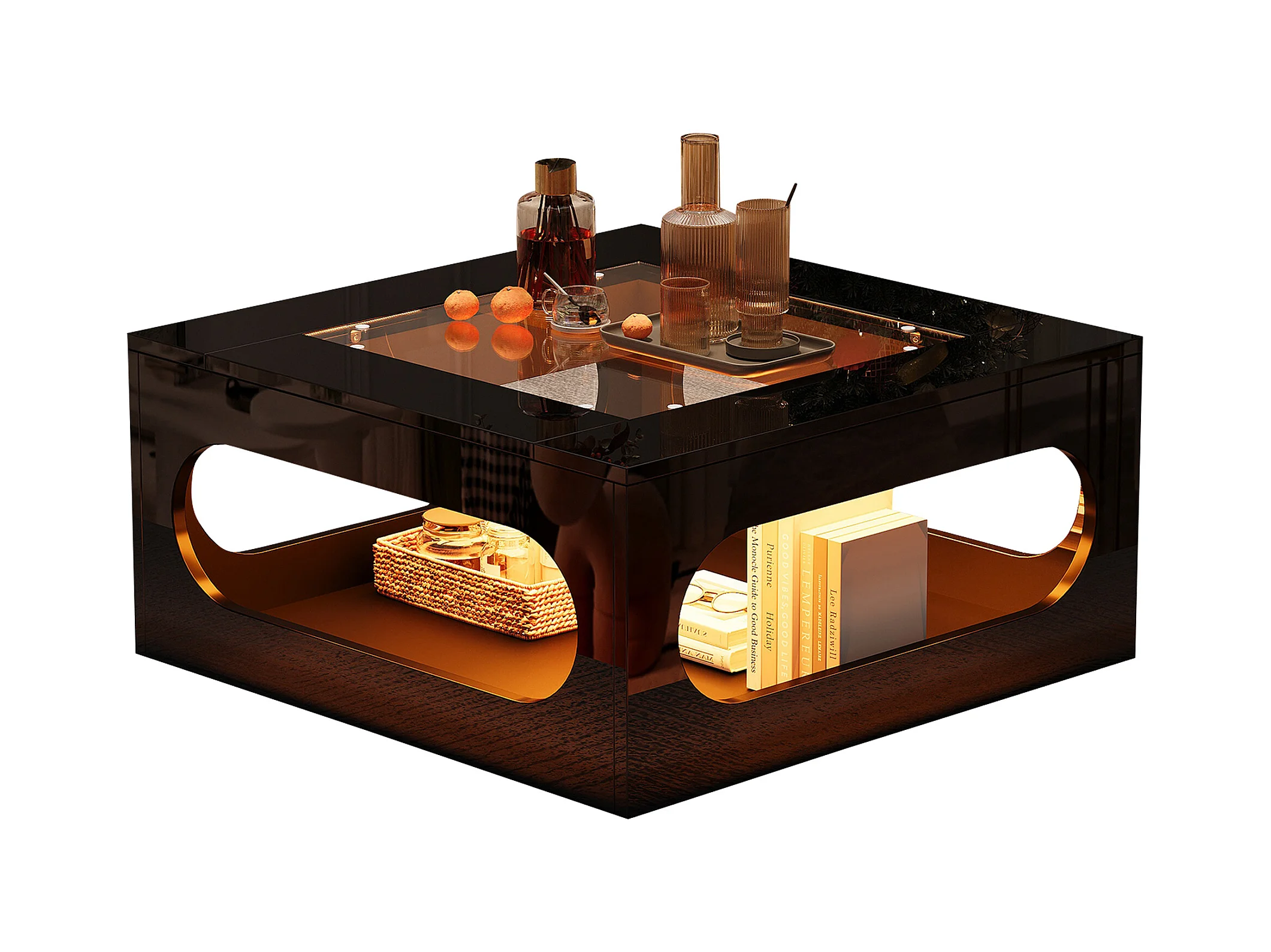 Table de salon brillante avec plateau en verre trempé + Leds - 70 x 70 x 35 cm - MDF - noir