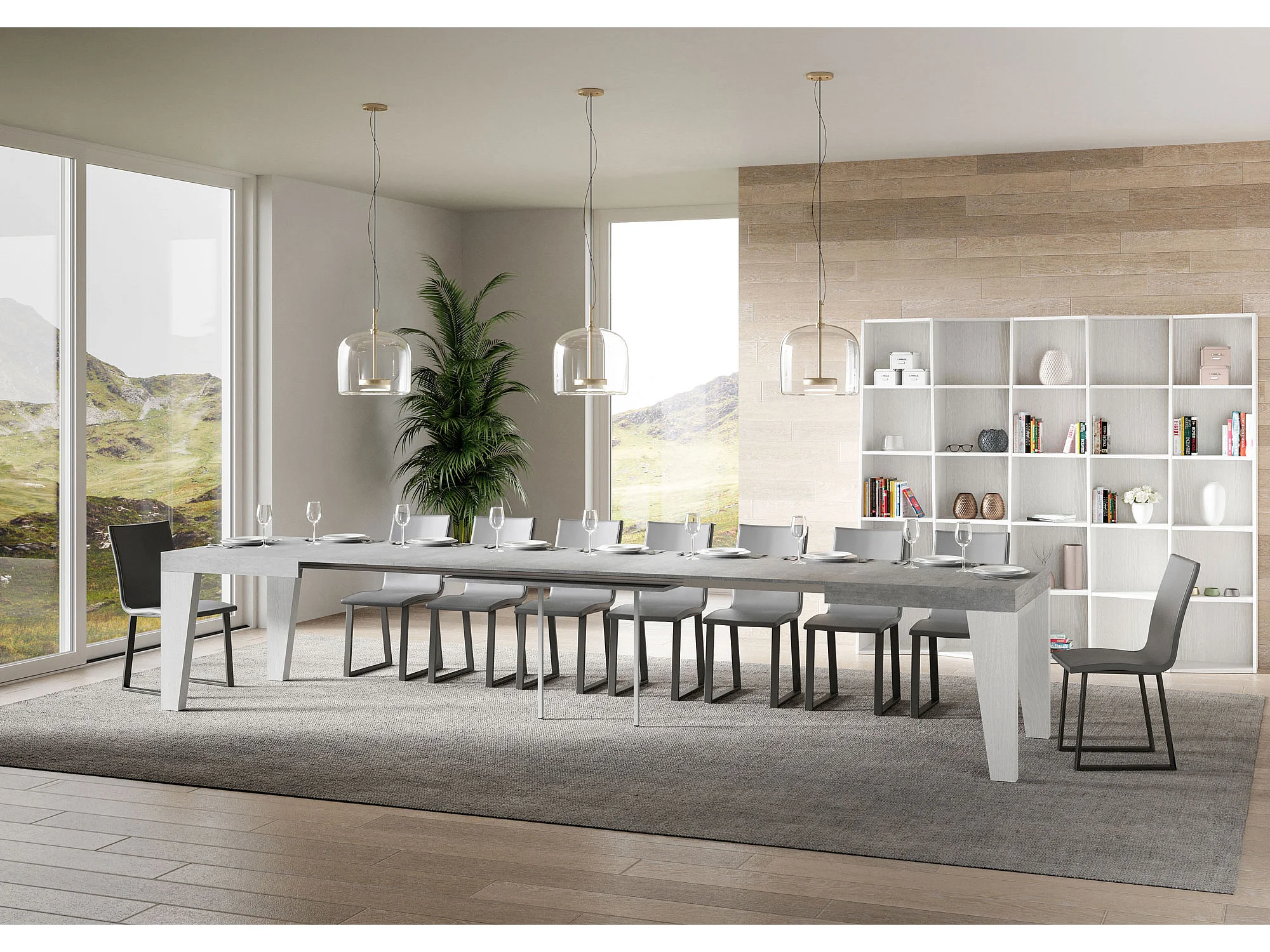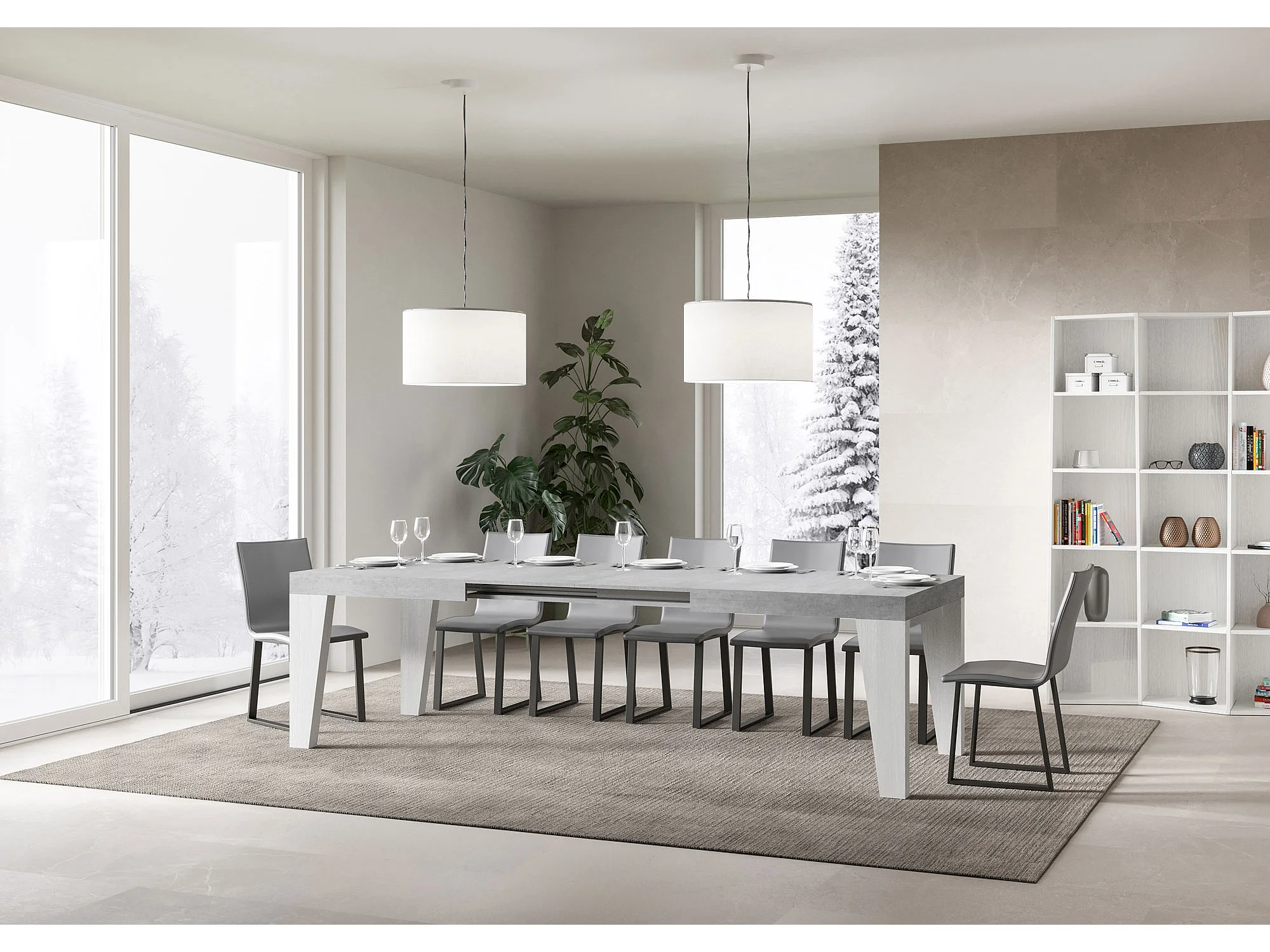 Table extensible 90x160/420 cm Naxy Mix dessus Gris Béton pieds Frêne Blanc