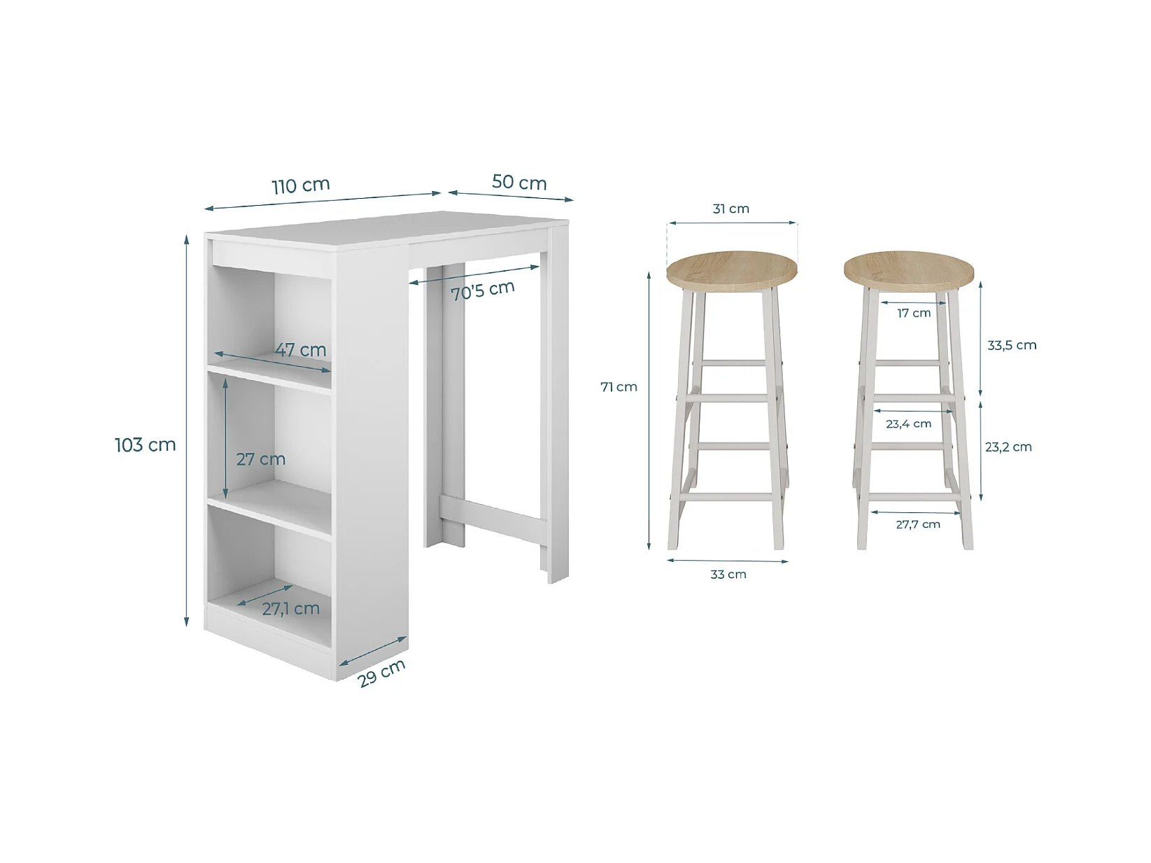 Table haute avec 2 tabourets pour Cuisine Salle à manger en Blanc 110x50x103cm Kyra