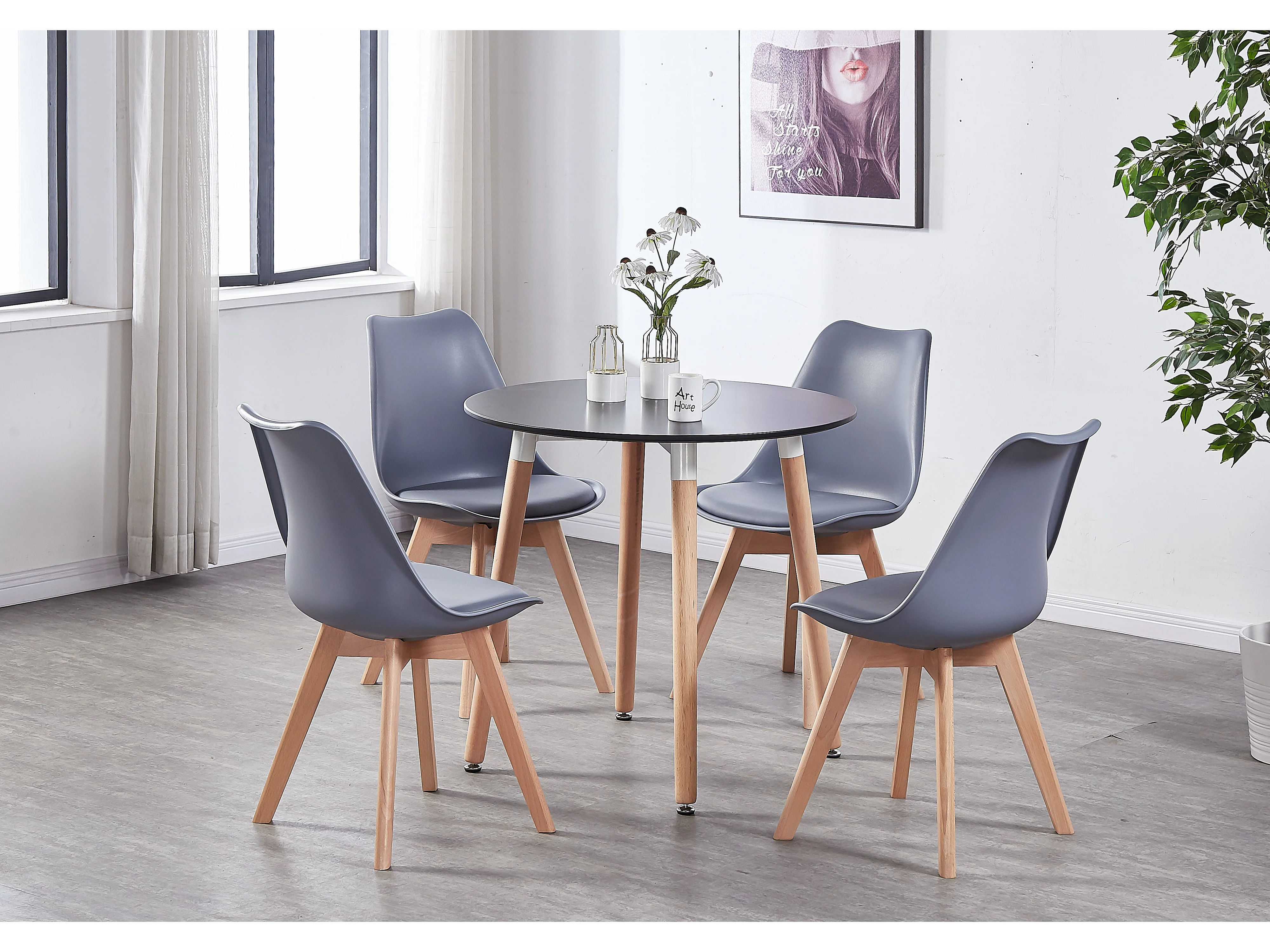 LORENZO HALO - Ensemble Salle à Manger - Table Noire Ronde + 4 Chaises Scandinaves Grises