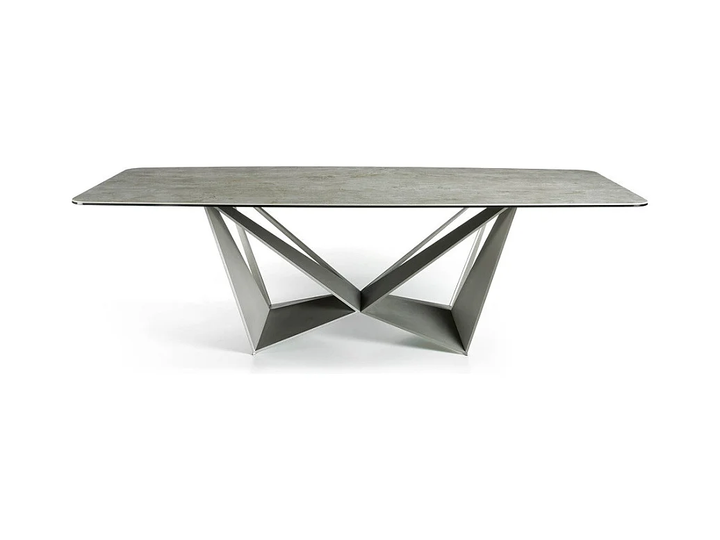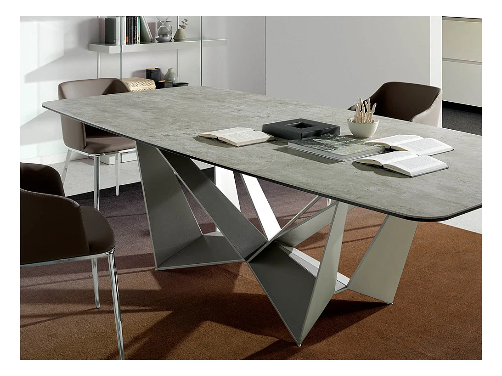 Table rectangulaire plateau porcelaine imitation ciment et pieds acier laqué gris Trypa 260cm