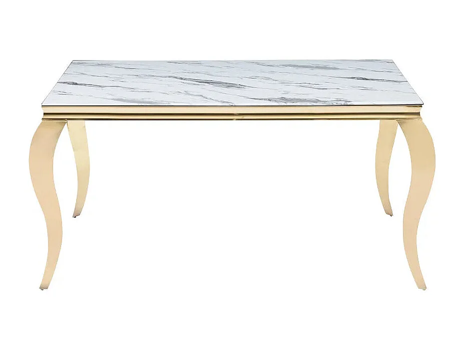 Table à manger BAROQUE 4 à 6 couverts 150x90 cm pieds gold plateau en verre effet marbré blanc
