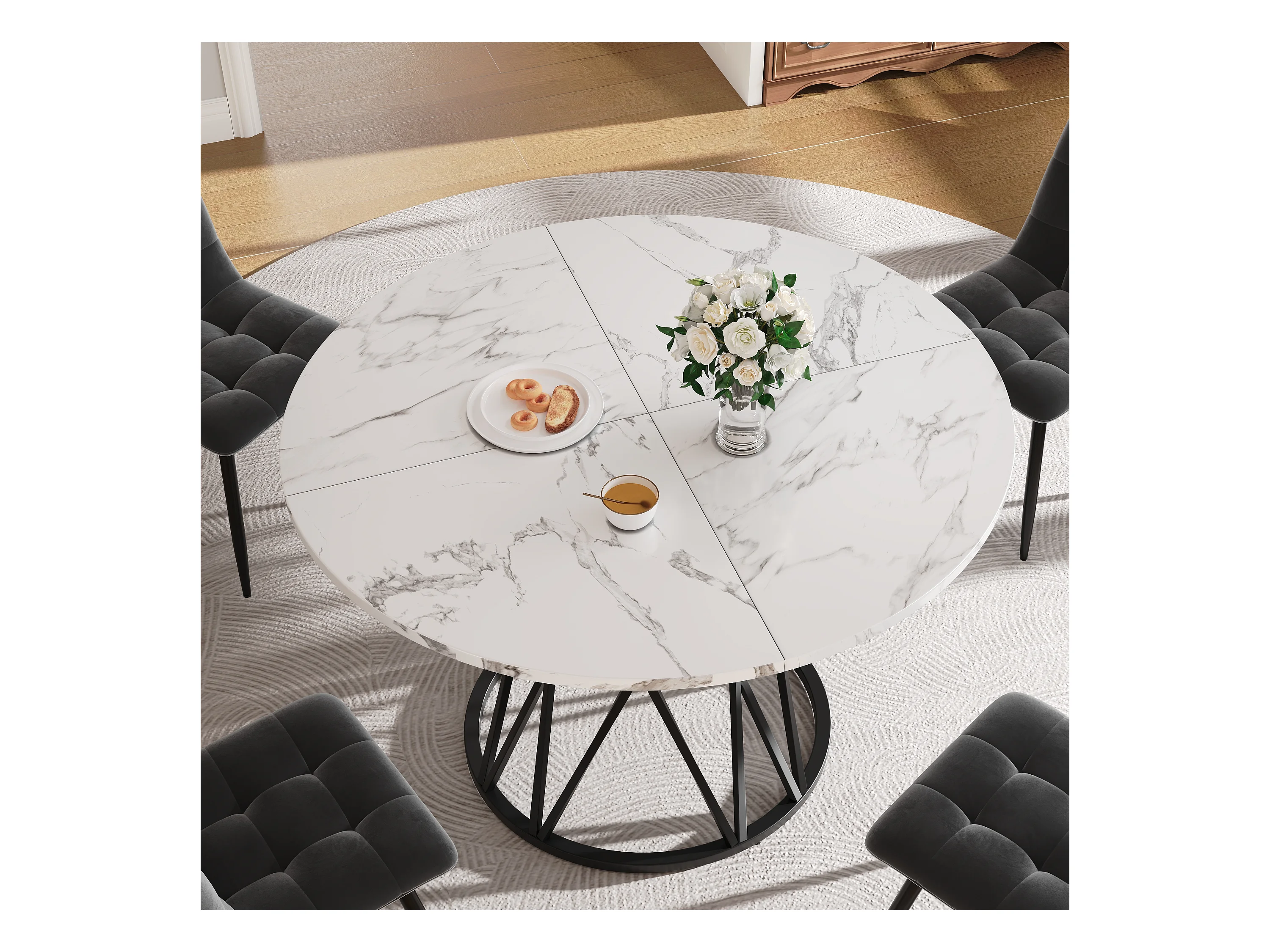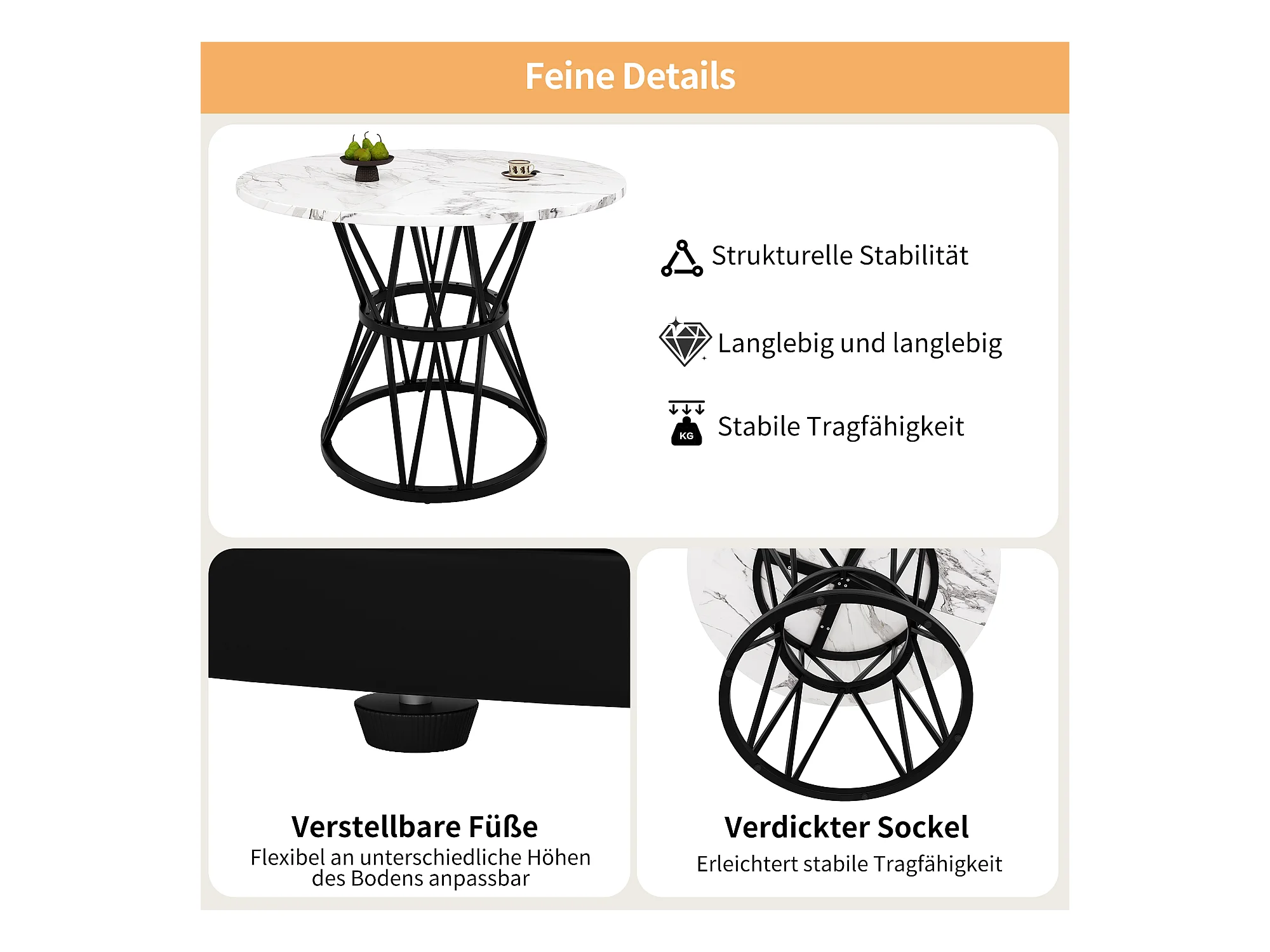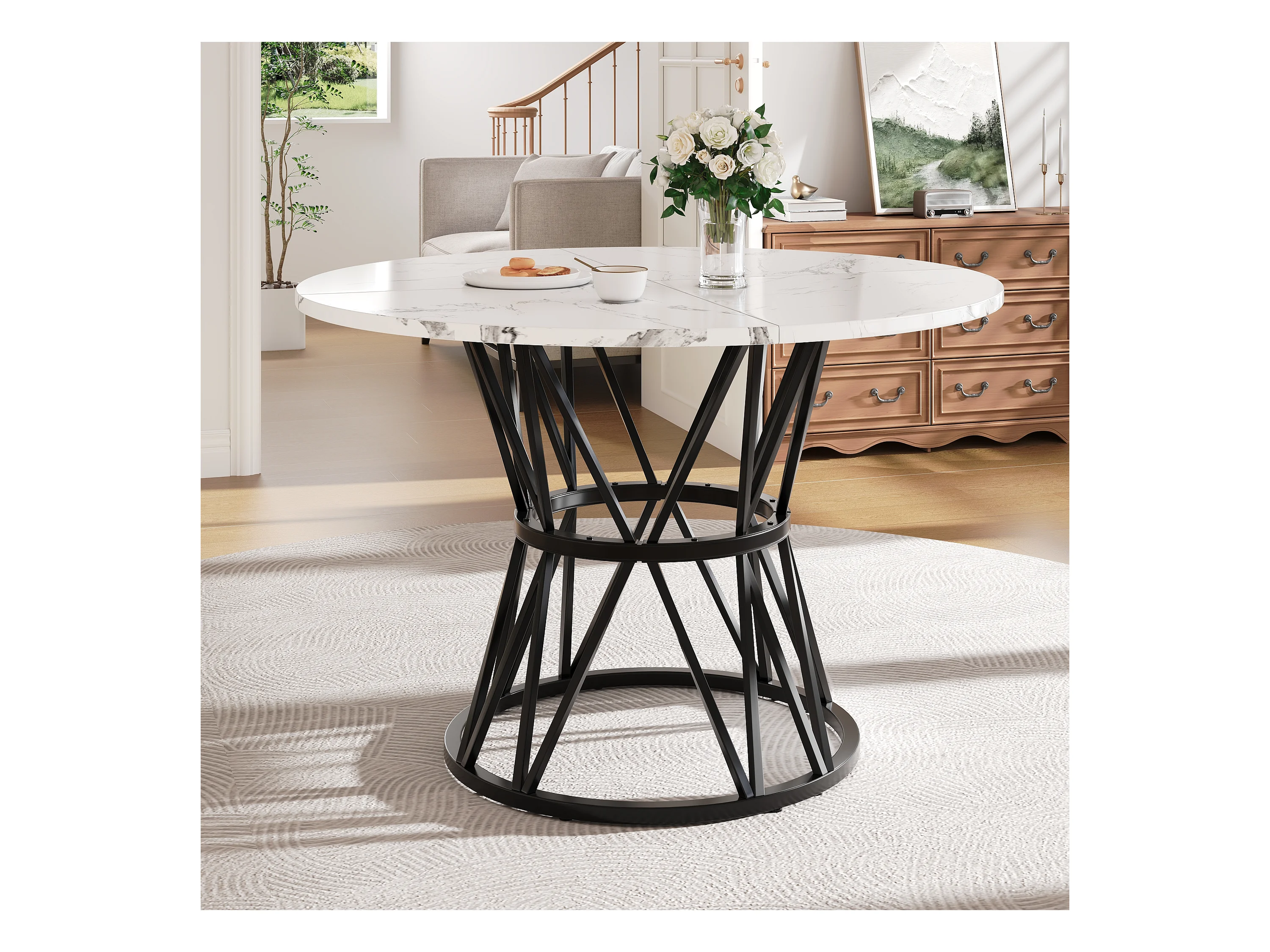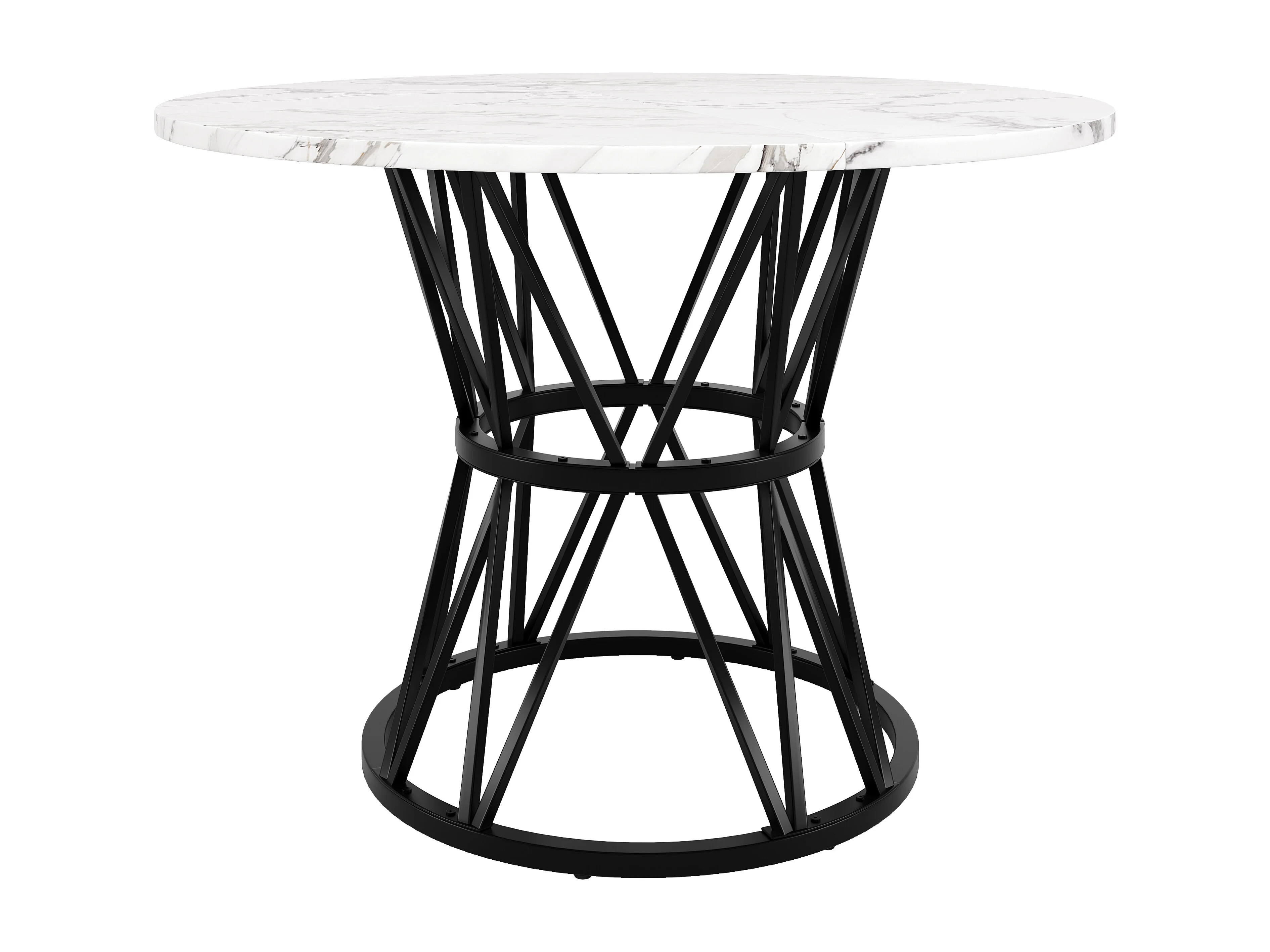Table ronde design, plateau MDF marbré, pieds métal noir, pour salle à manger et salon (100x100x76cm)