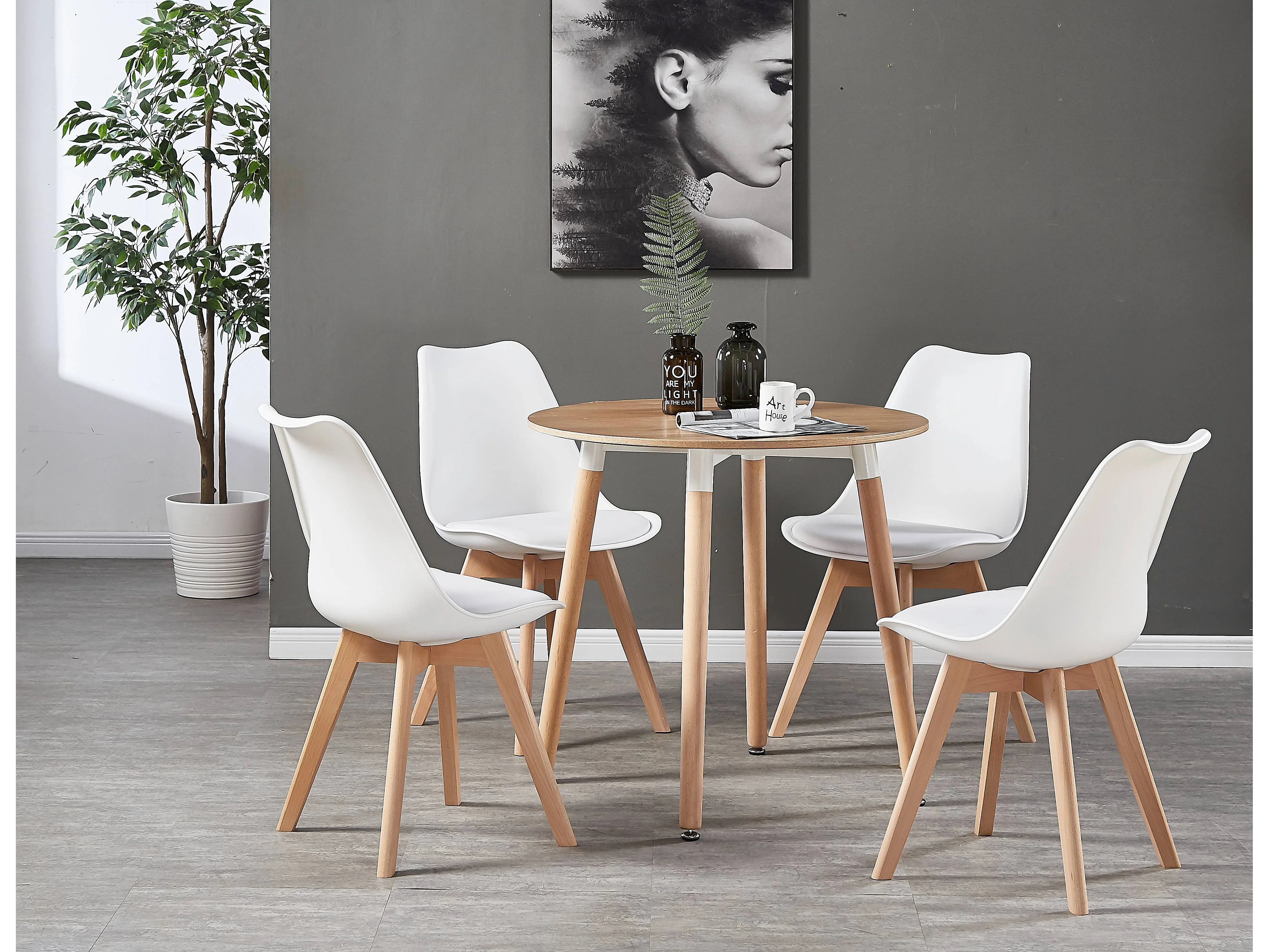 LORENZO HALO - Ensemble Salle à Manger - Table Ronde Effet Chêne + 4 Chaises Scandinaves Blanches