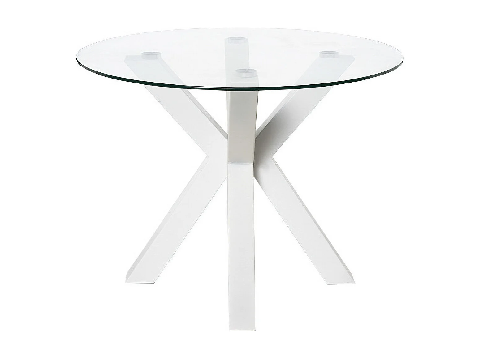 Table ronde moderne Jadys – Plateau en verre et pieds croisés en métal-Couleur Blanc-Diamètre 120 cm