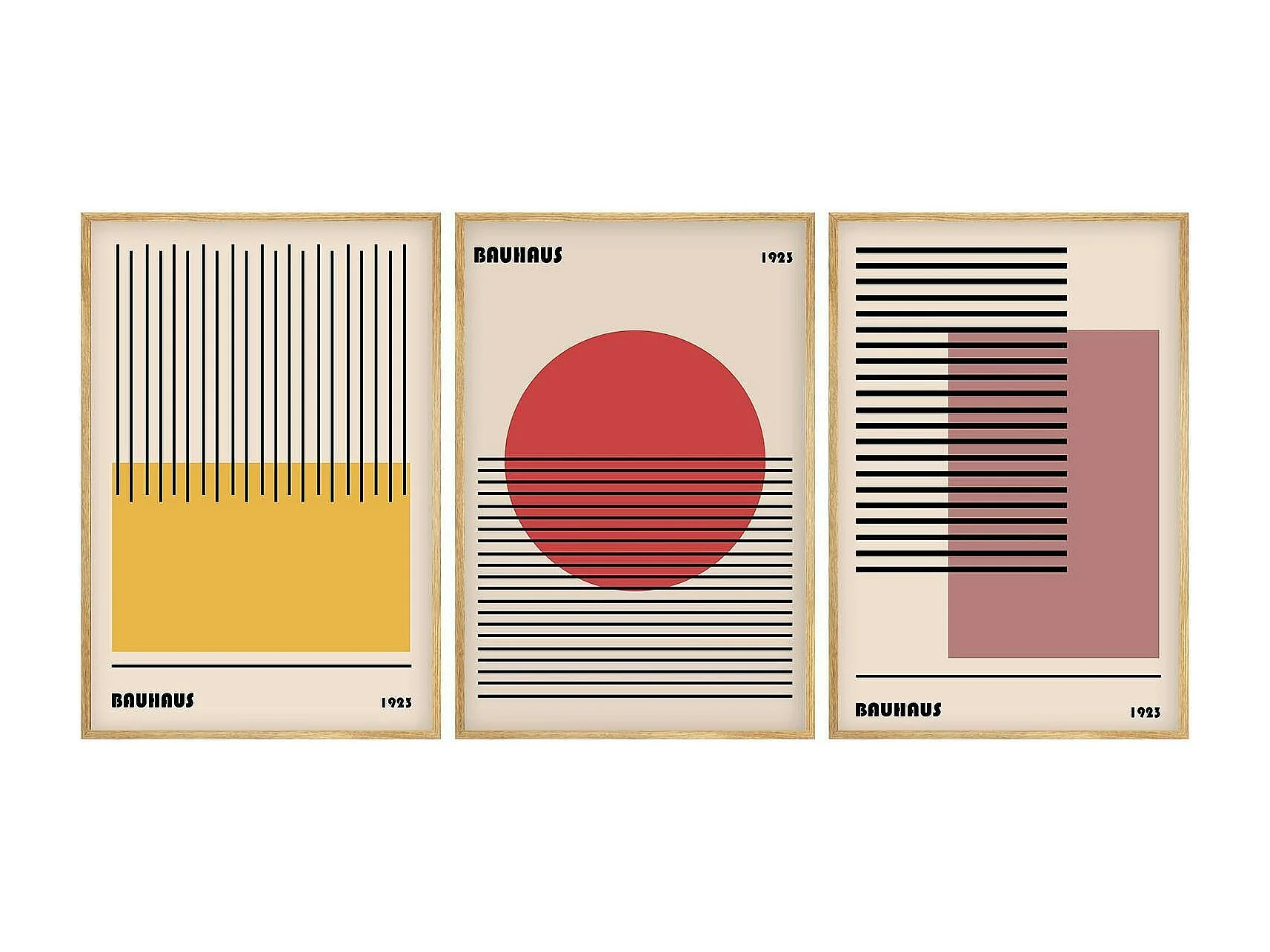 Tableau abstrait – style Bauhaus, cadre bois (lot de 3)