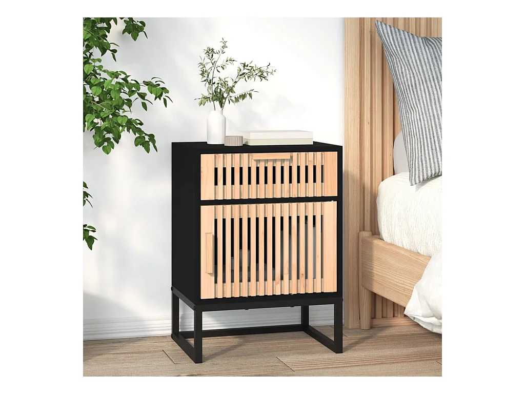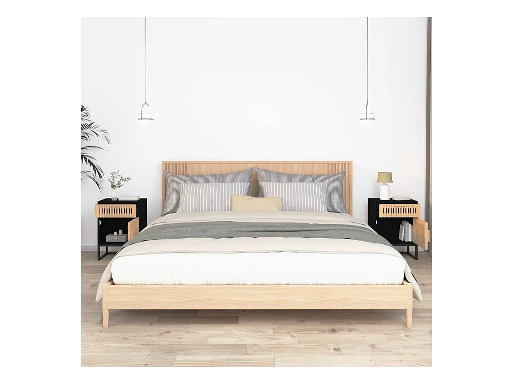Lot de 2 Tables de chevet Noir Bois de pin massif et rotin naturel GHR22989