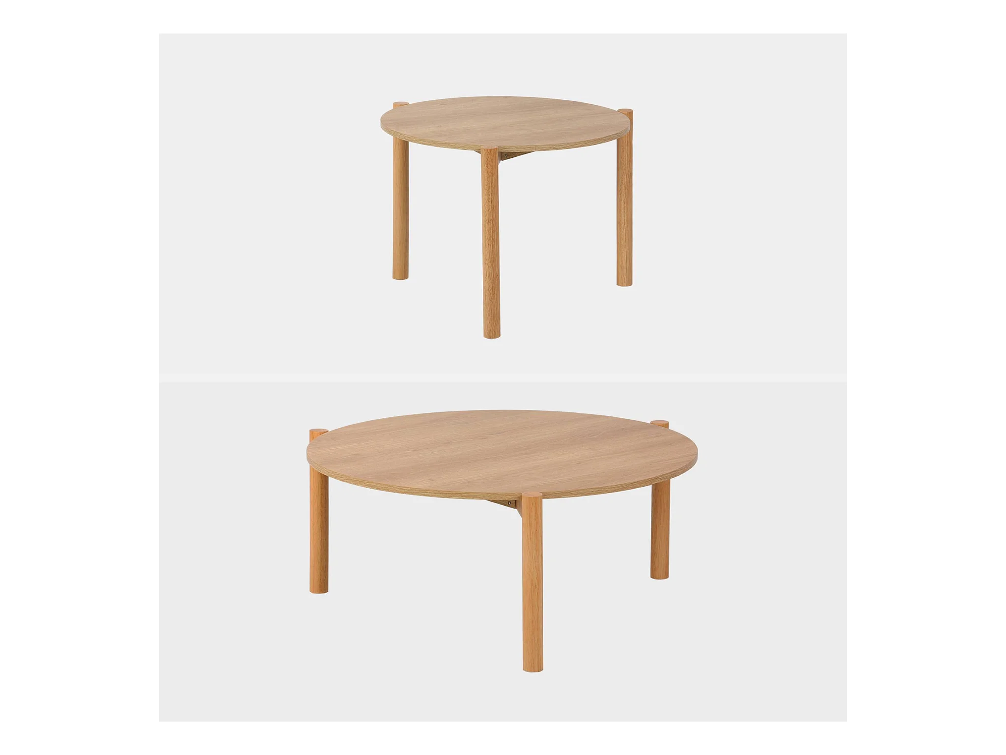 Set de 2 tables basses rondes plateau effet bois chêne et pieds en bois de sapin. Ø40cm et Ø60cm