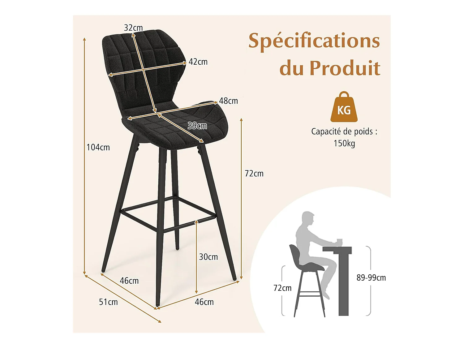 Tabouret de bar tissu beige