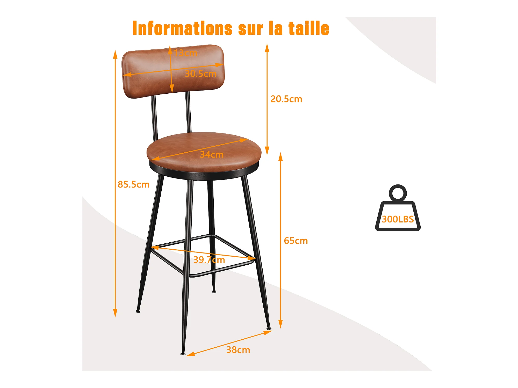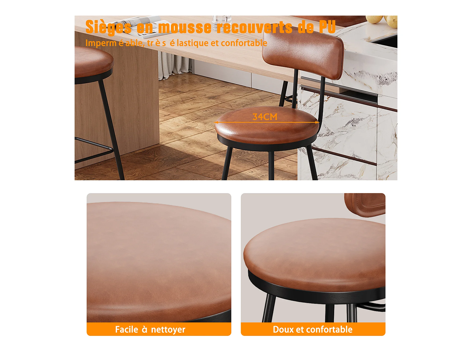 Lot de 4 chaises de bar en similicuir marron, design moderne avec dossier ergonomique, cadre métallique robuste, confortables et faciles à nettoyer