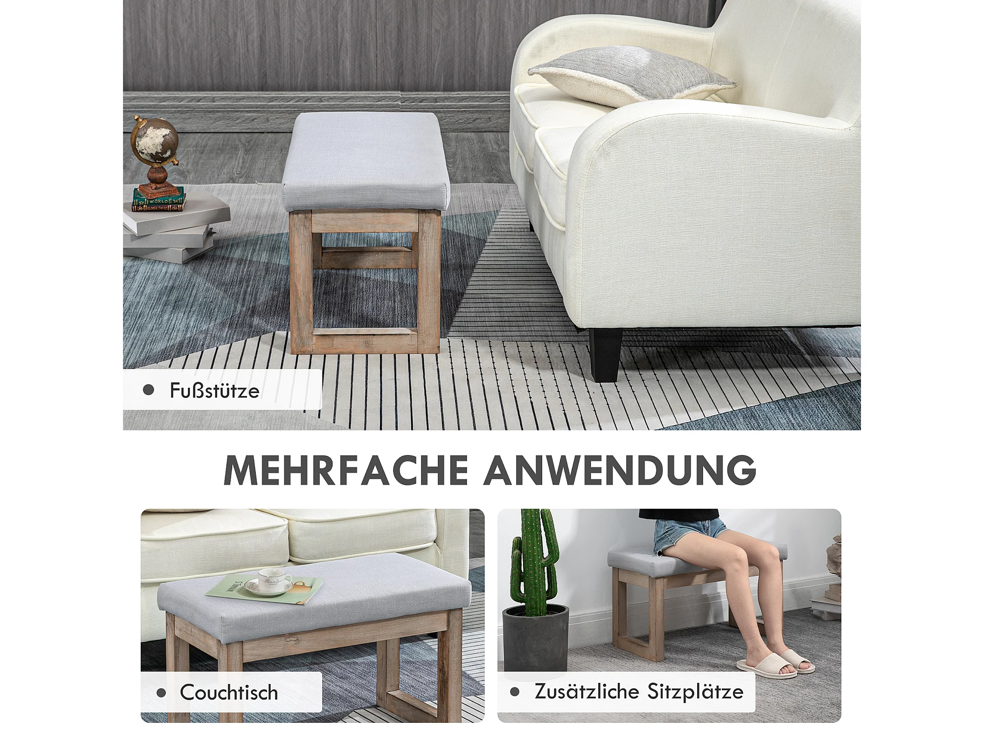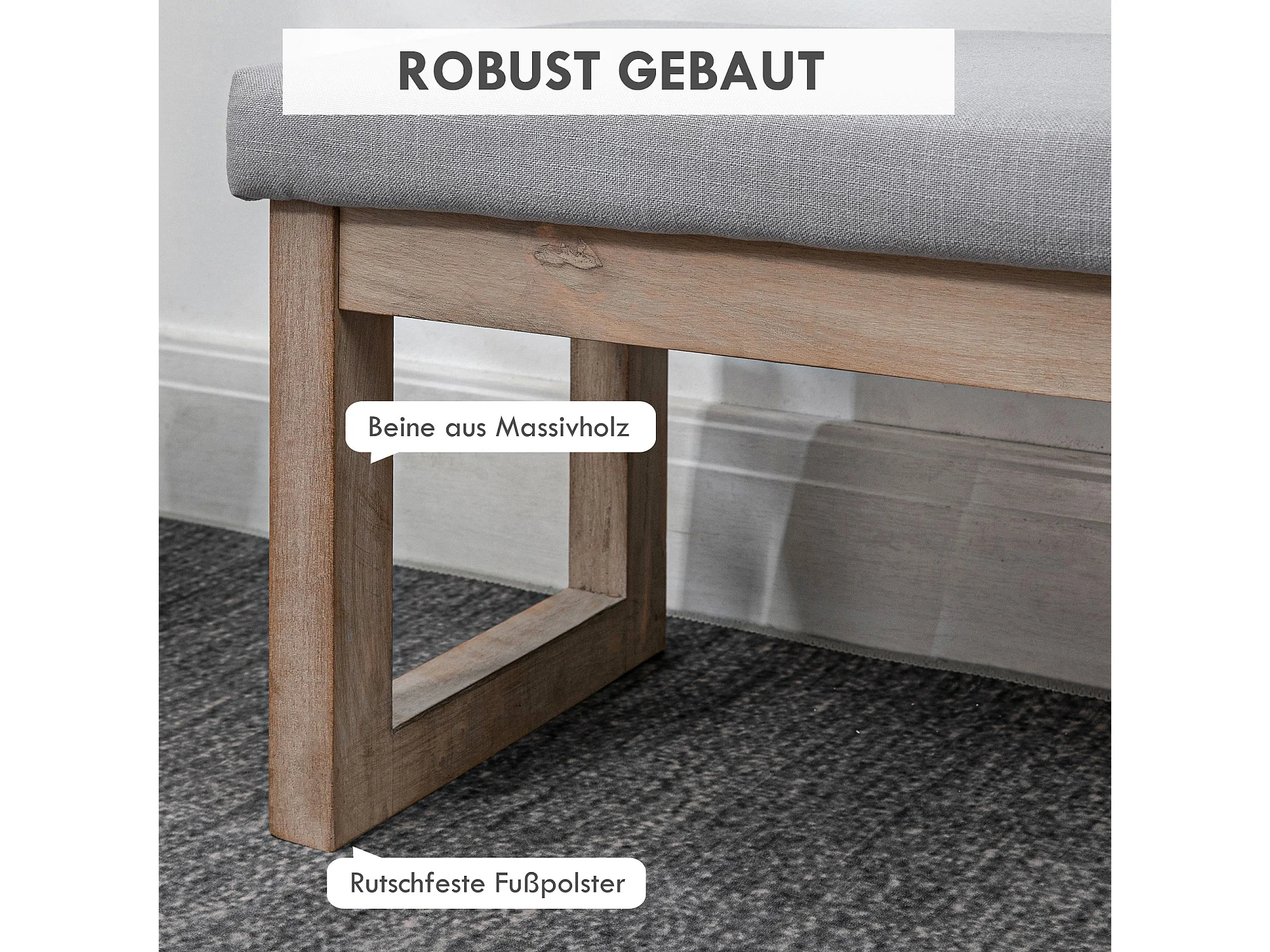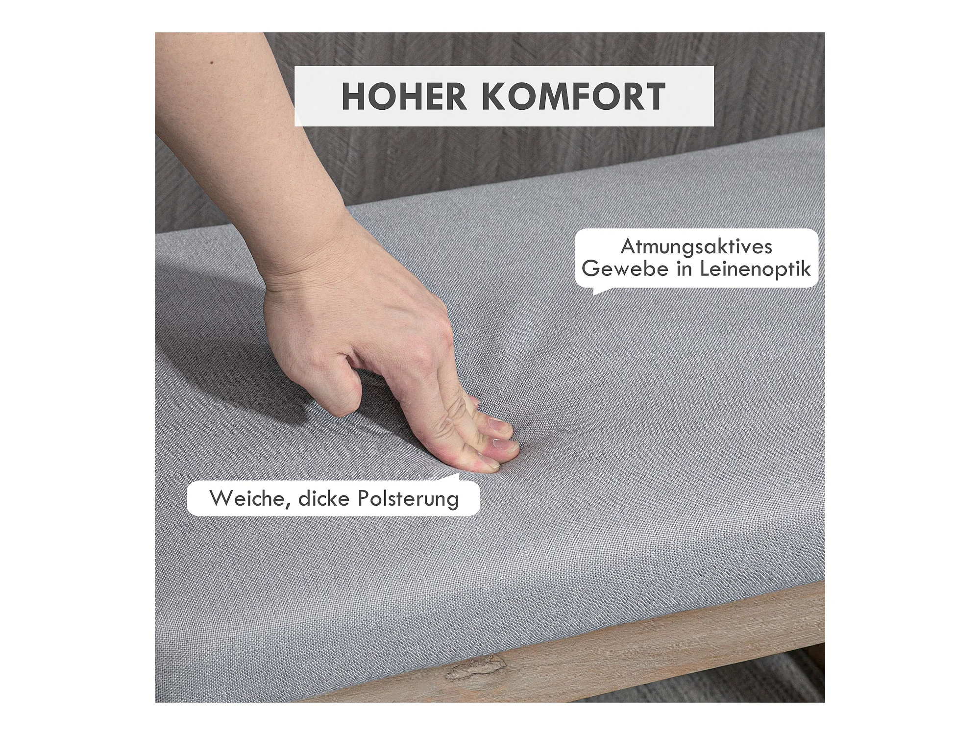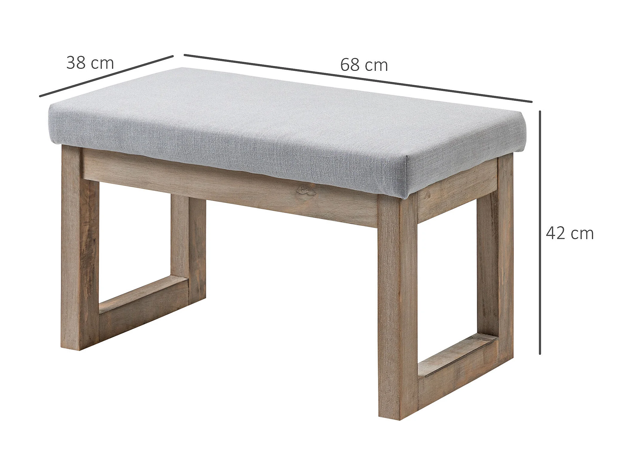 Tabouret de rangement avec pieds en bois, pouf rembourré, tissu polyester, gris (68x38x42 cm)