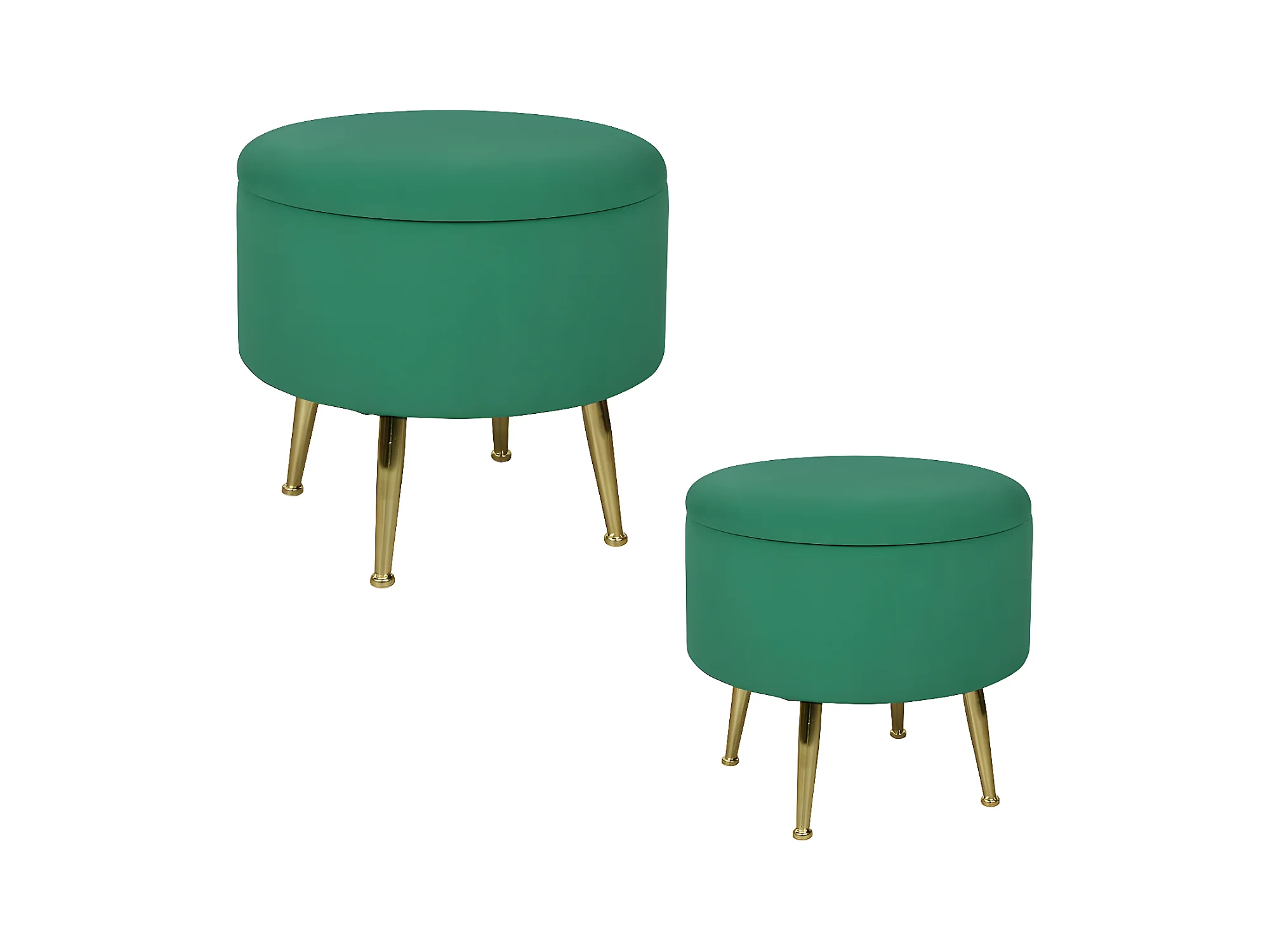 Tabouret pouf rond tissu vert pieds dorés TIM (lot de 2)