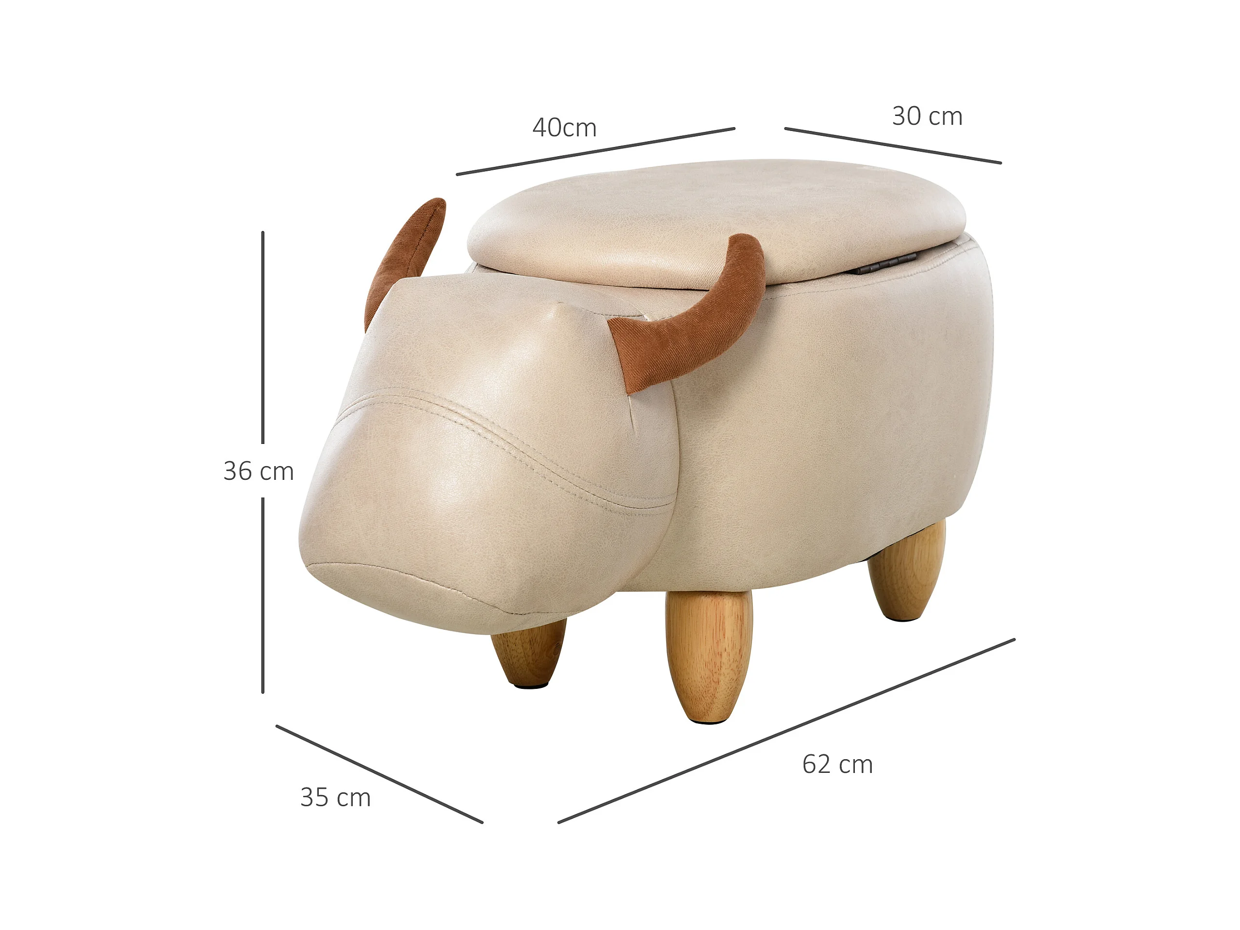 Tabouret vache - pouf vachette - pouf taureau coffre de rangement 2 en 1 - pieds bois d'hévéa revêtement synthétique crème
