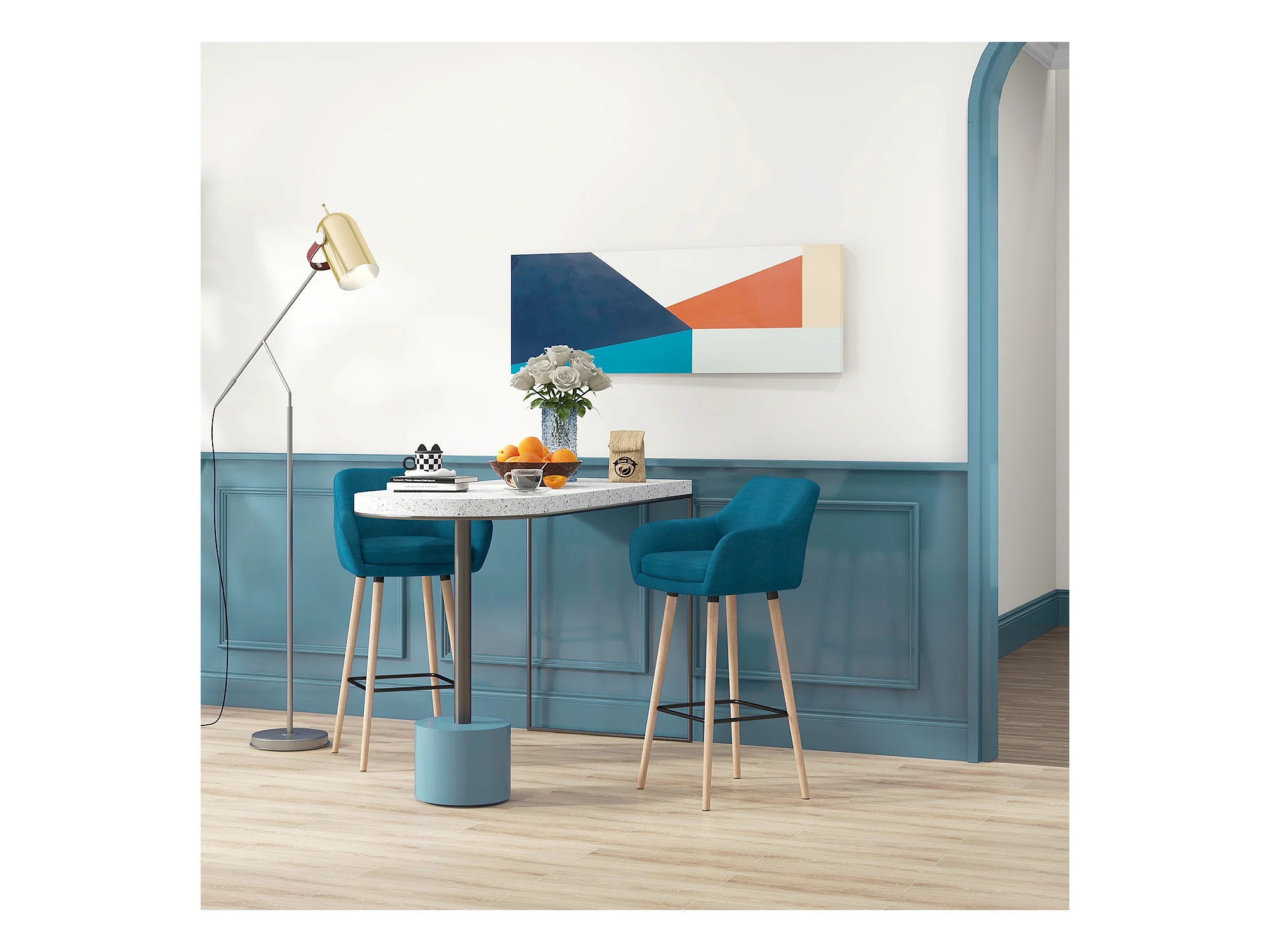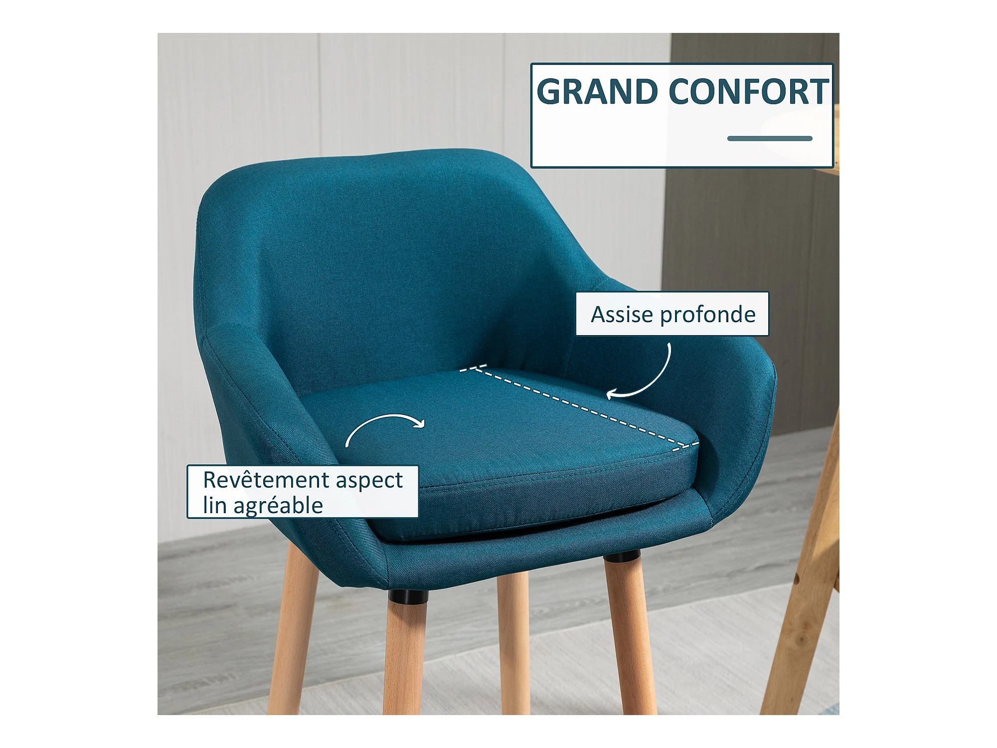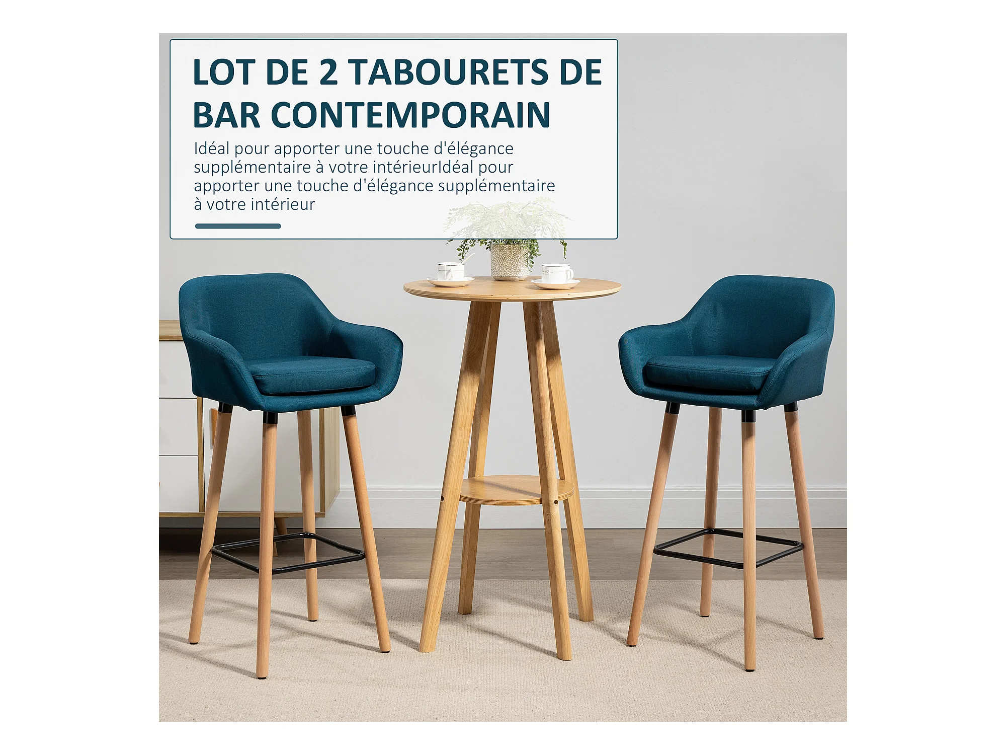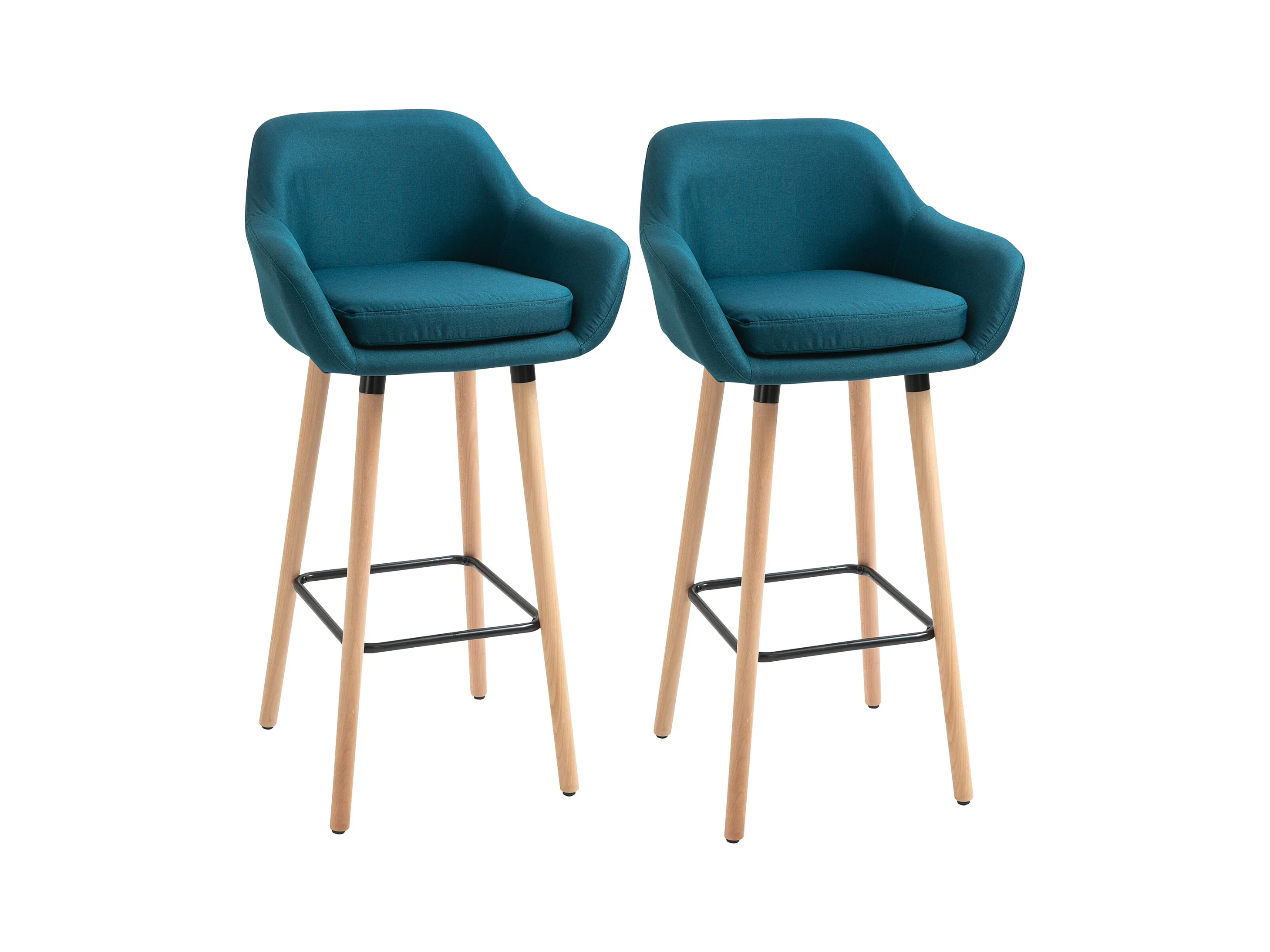 Tabourets de bar design scandinave - lot de 2 tabourets de bar grand confort avec repose-pieds et accoudoirs - bois de hêtre lin bleu canard