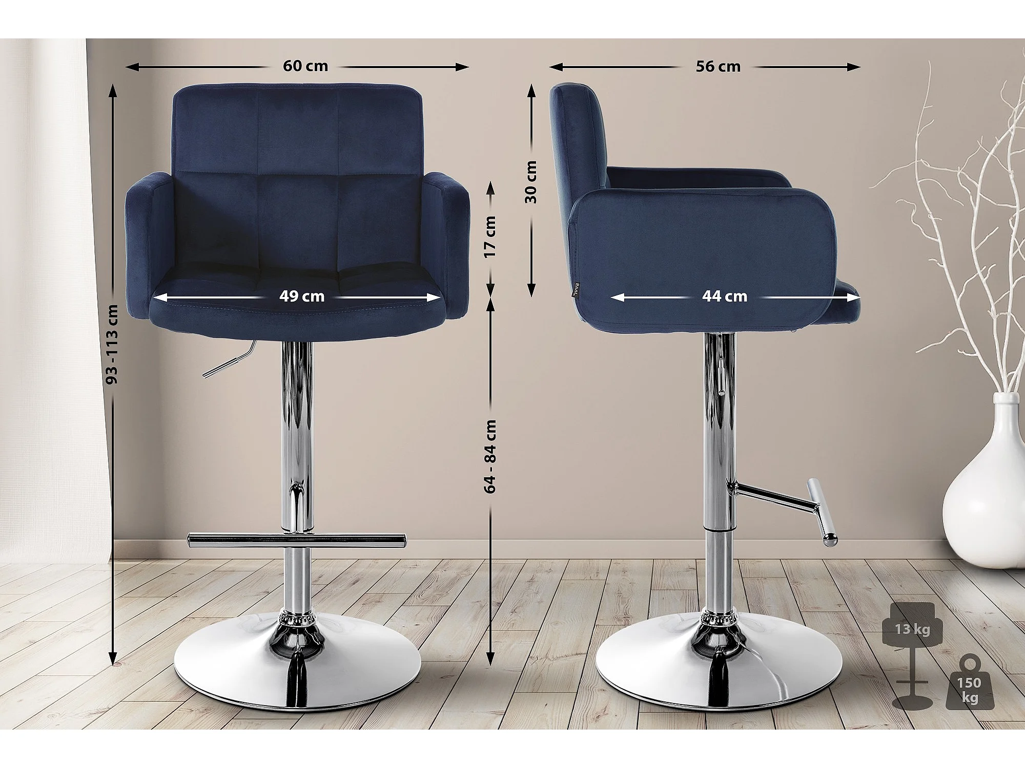 Tabouret de bar - Velours & Chrome - Bleu - Toni