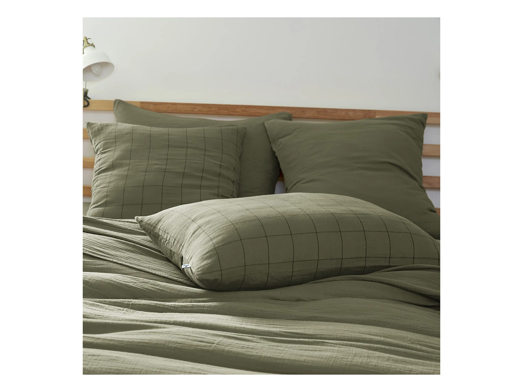 Taie d'oreiller à carreaux double gaze de coton kaki 50x70
