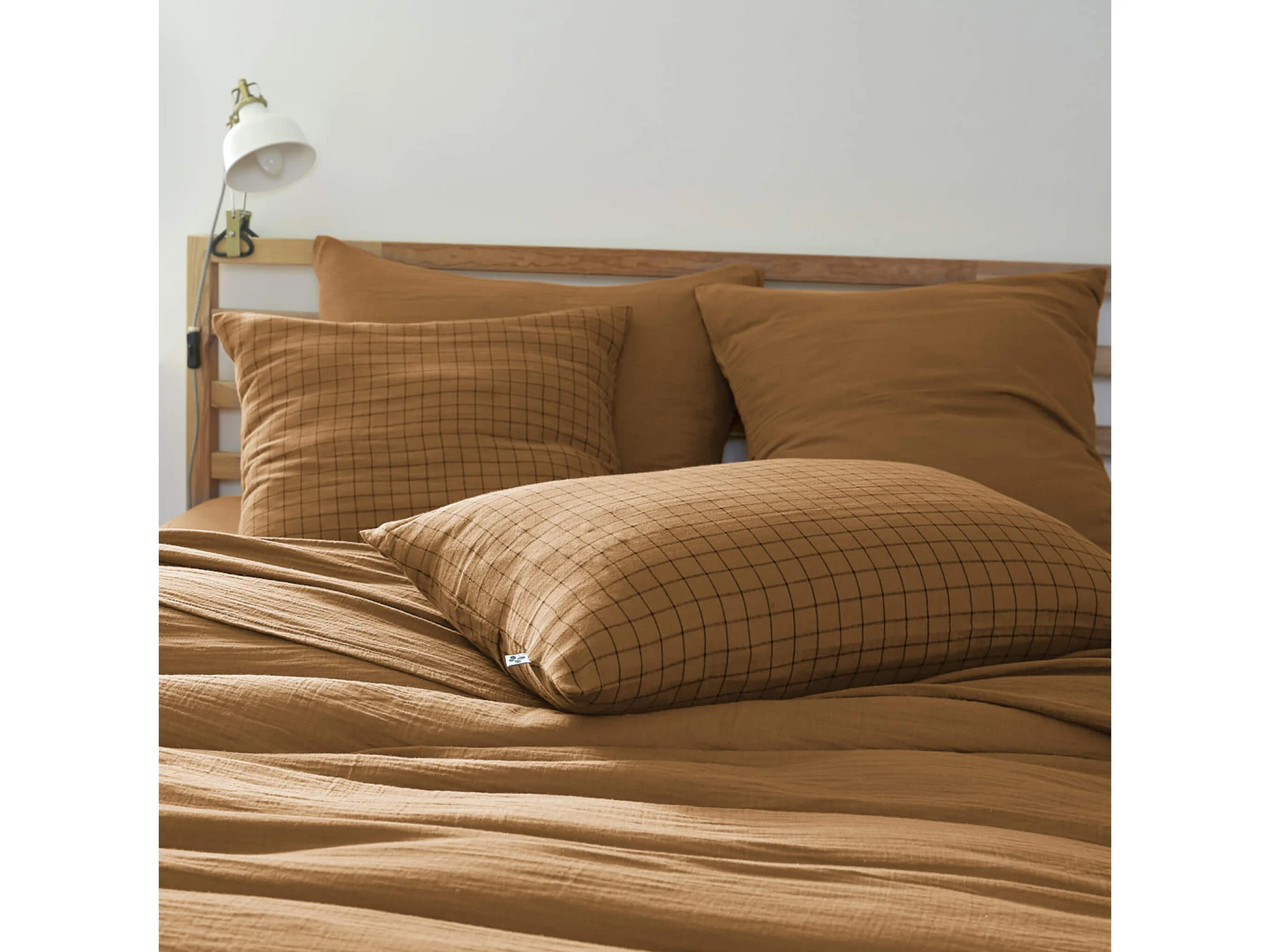 Taie d'oreiller 50x70 double gaze de coton grands carreaux camel Terre de Nuit