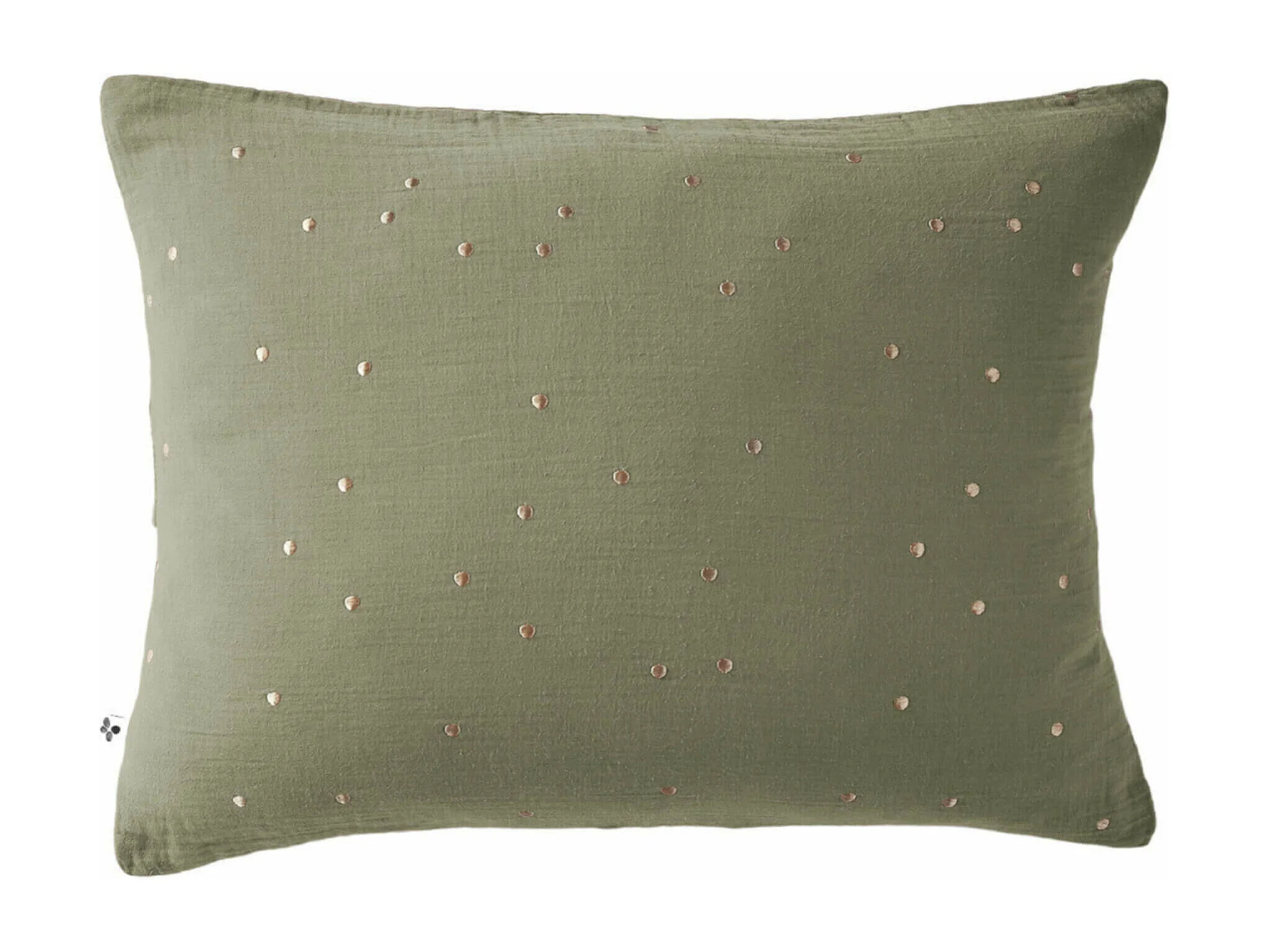 Taie d'oreiller à pois brodés double gaze de coton kaki 50x70 cm