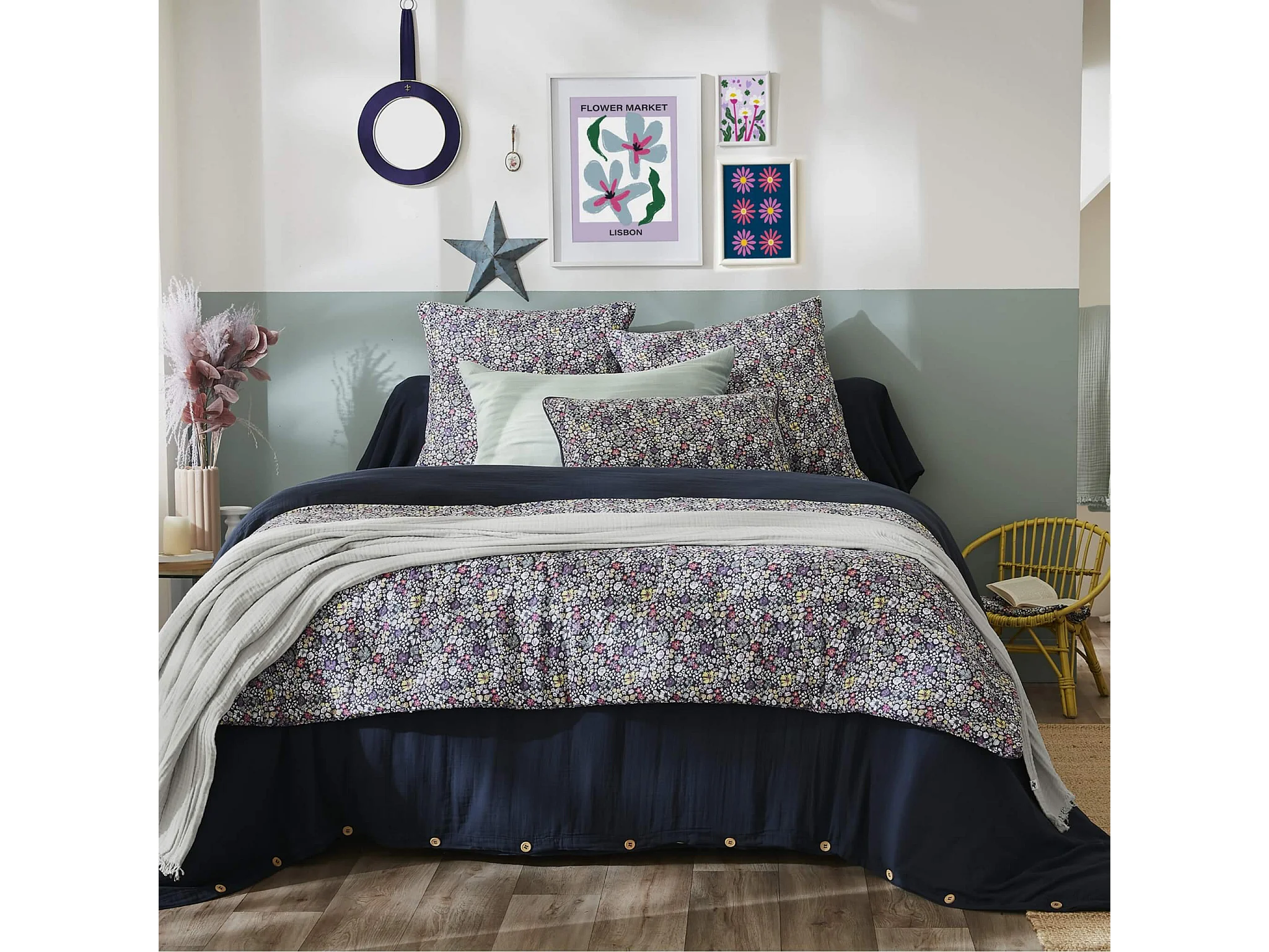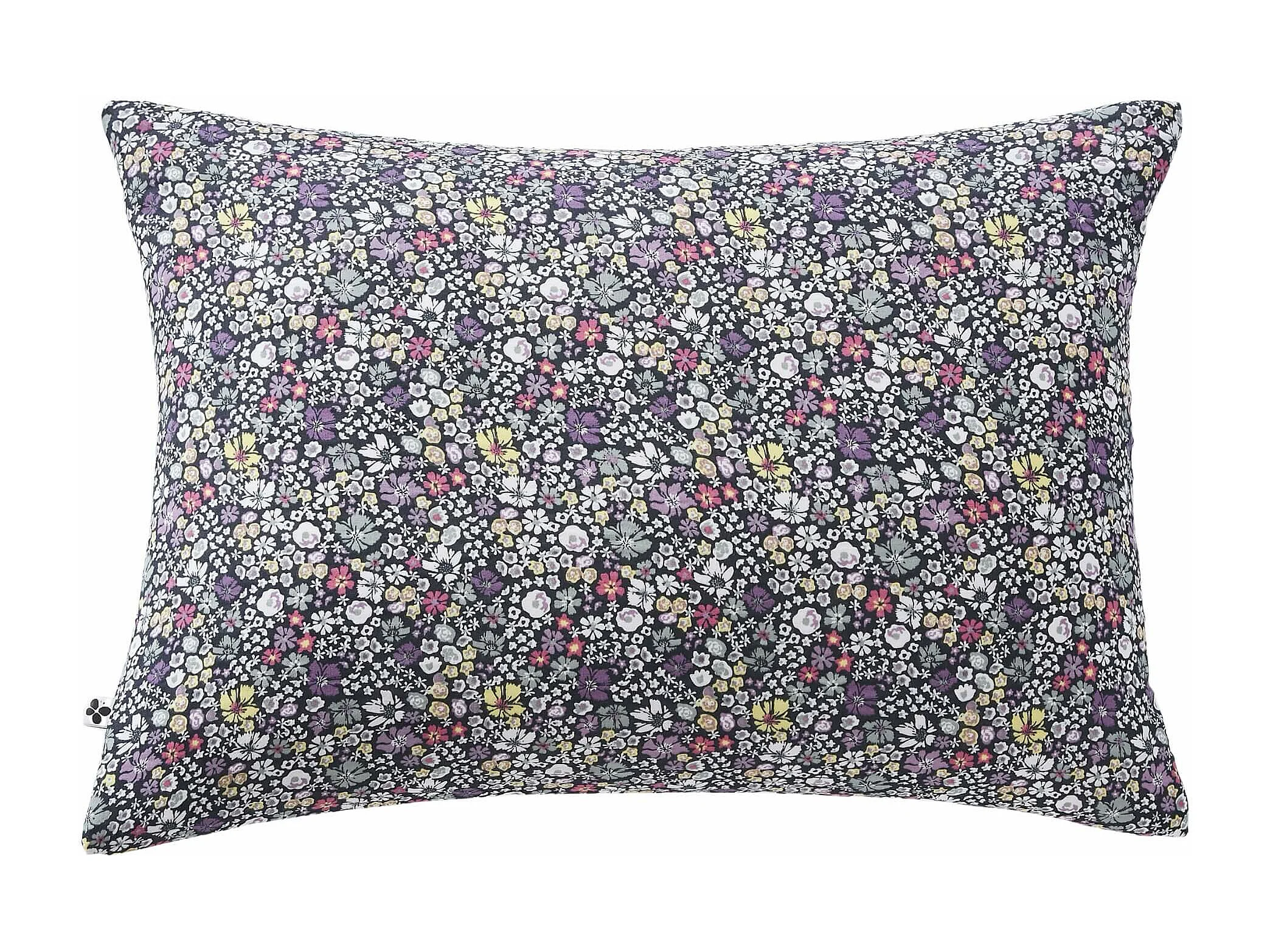 SOIZIC - Taie d'Oreiller 50x70cm Gaze de Coton Imprimé Bleu-Violet Imprimé Fleurs
