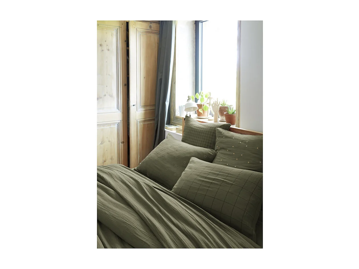 Taie d'oreiller brodée double gaze de coton kaki 60x60 cm